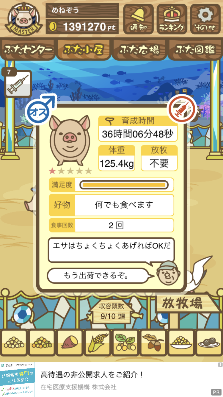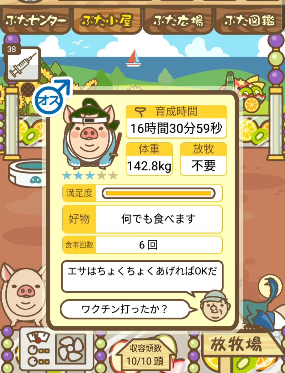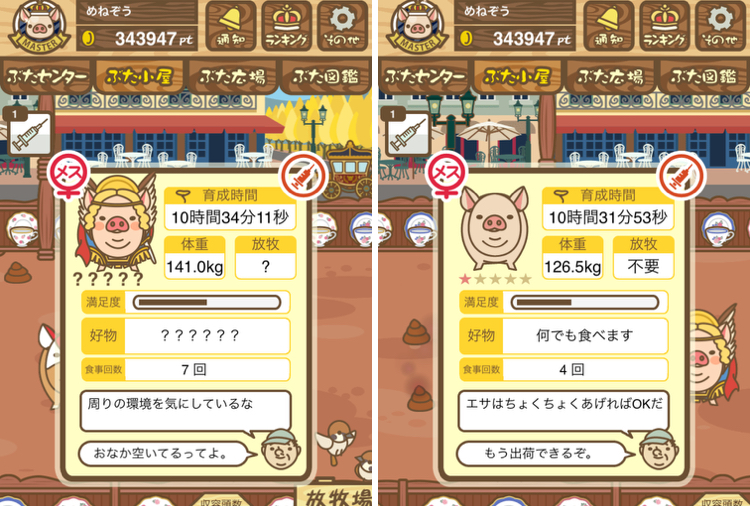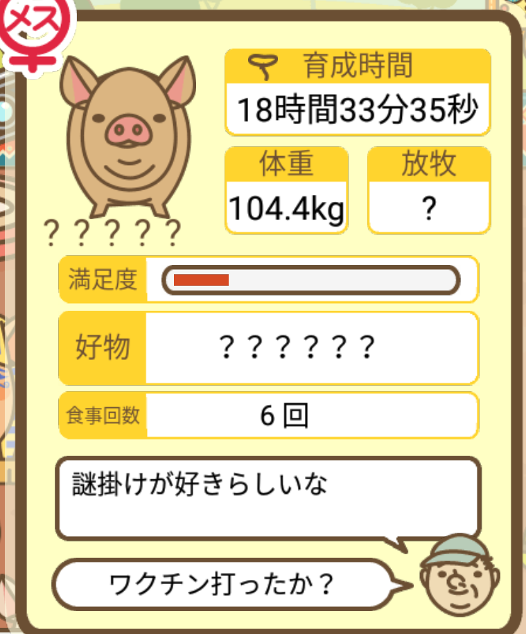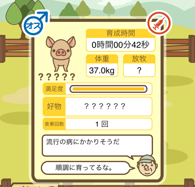 - ご覧のように、農夫の方は餌やりが済んだ後ずっと放牧していたので「放牧済み」に、弁護士の方は餌やりが済んだ後そのまま豚小屋に置いていたので「不要」=未放牧状態になっていました。 -- デンコウケッサイ[DOmfthm6KBs] 2022/09/04 (日) 22:42:23