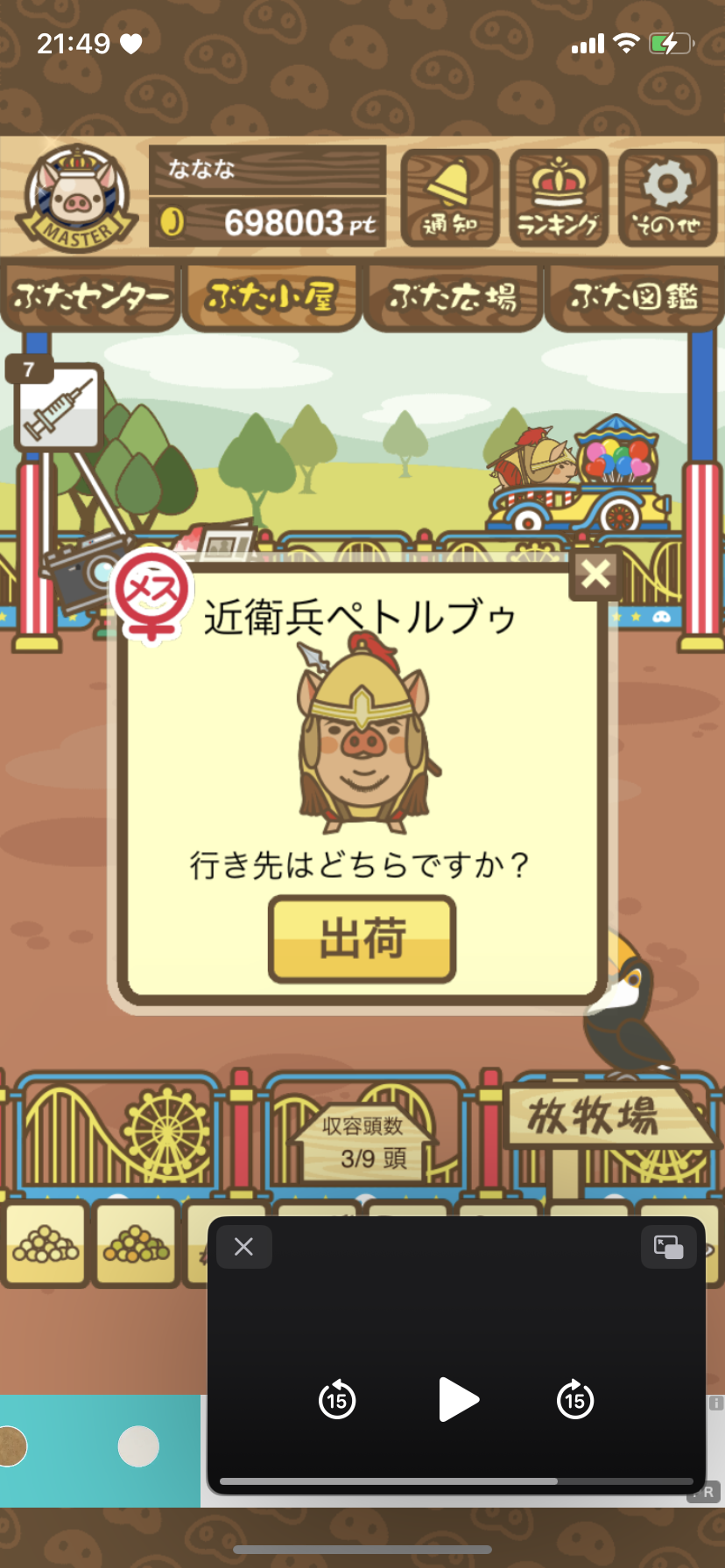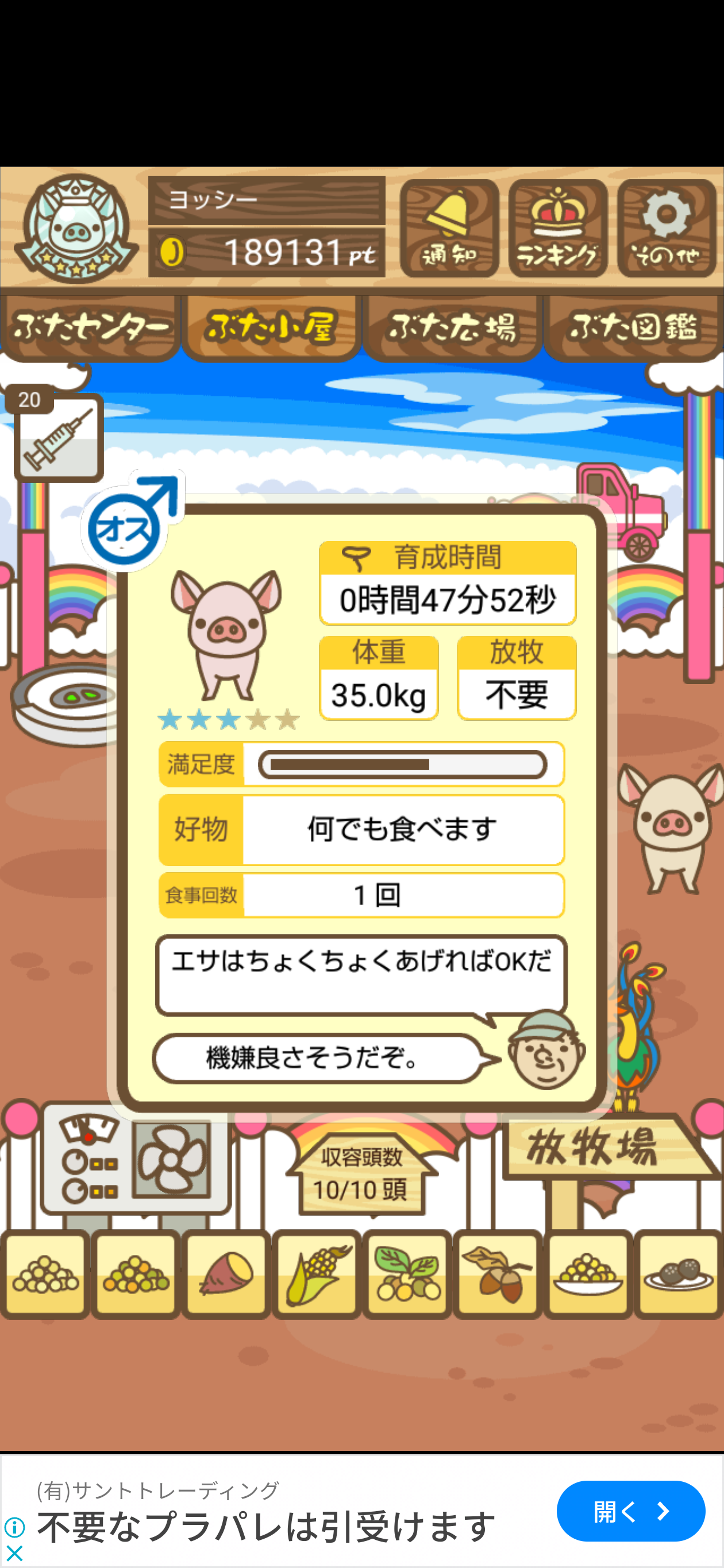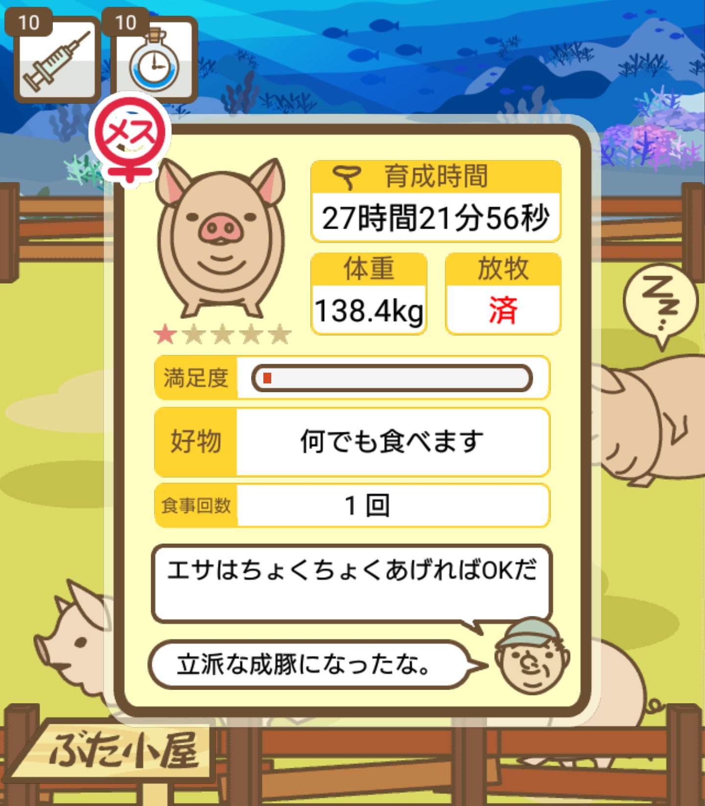 - ご覧のように、農夫の方は餌やりが済んだ後ずっと放牧していたので「放牧済み」に、弁護士の方は餌やりが済んだ後そのまま豚小屋に置いていたので「不要」=未放牧状態になっていました。 -- デンコウケッサイ[DOmfthm6KBs] 2022/09/04 (日) 22:42:23