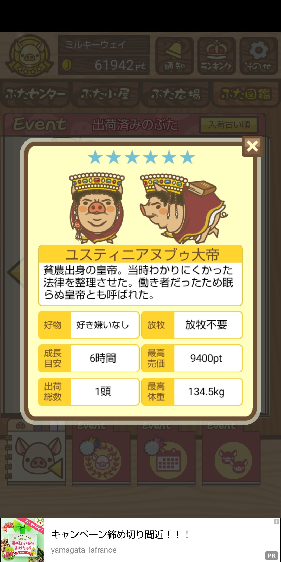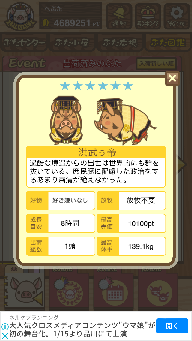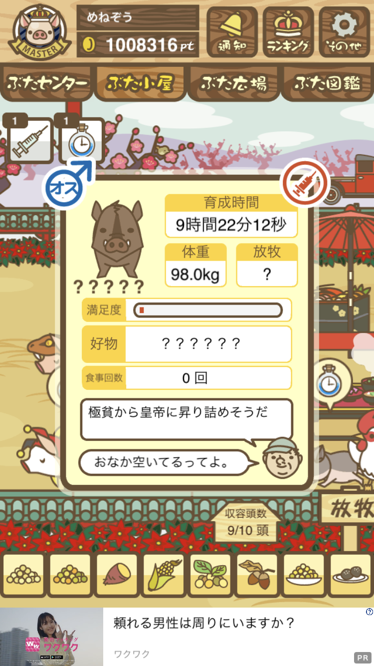 次は超出世系白1頭だけ放牧場、ぶた小屋には1頭もいない状態で成豚するとどうなるか検証してみます。 -- ひろあき[FDSOngjOnqU] 2022/09/02 (金) 21:31:55 - 検証の結果、農夫エイブゥになりました。