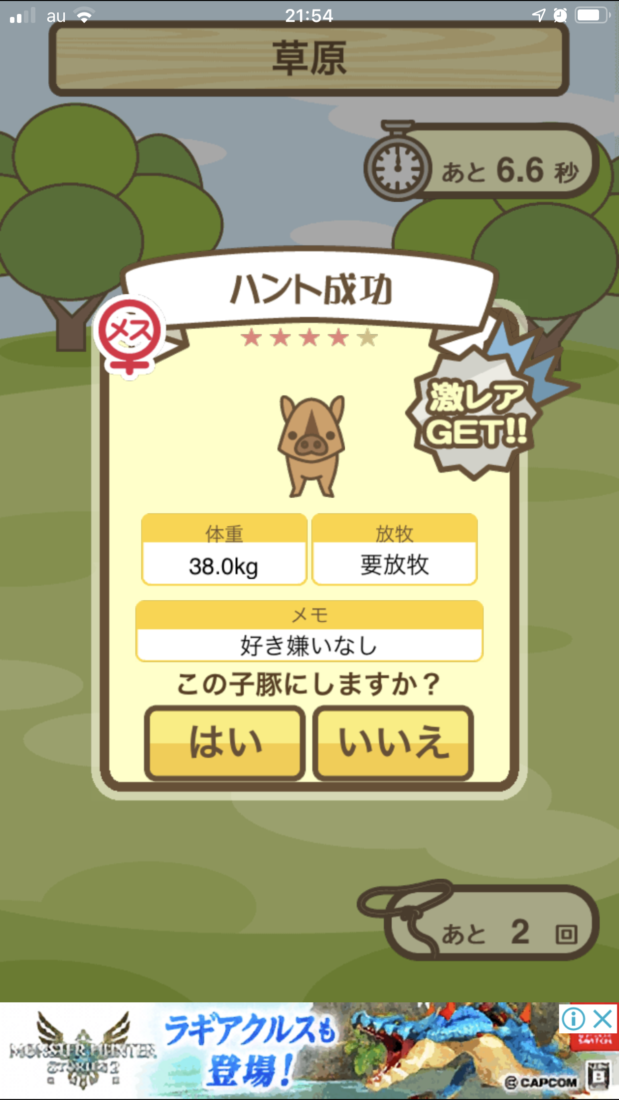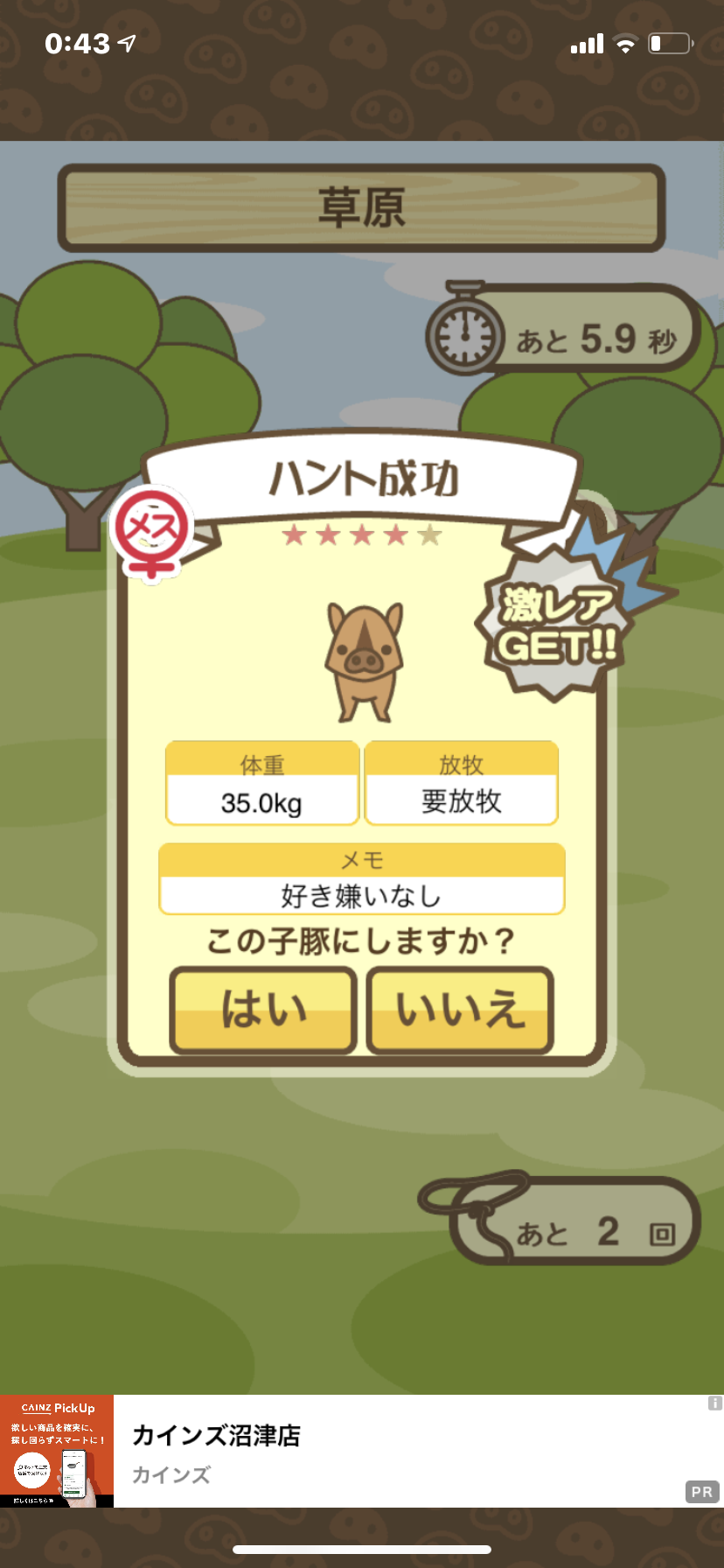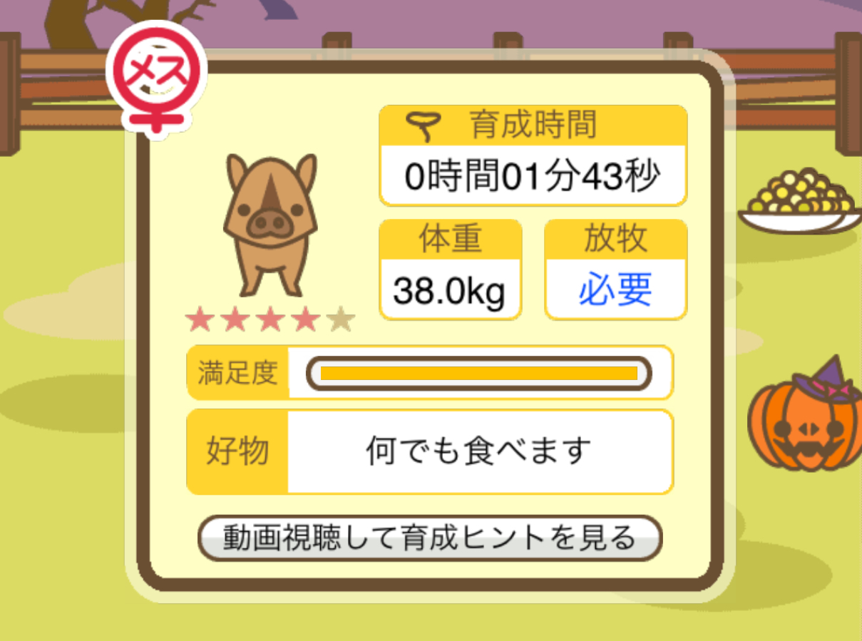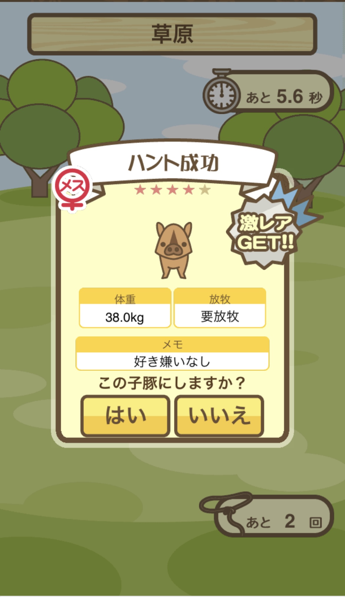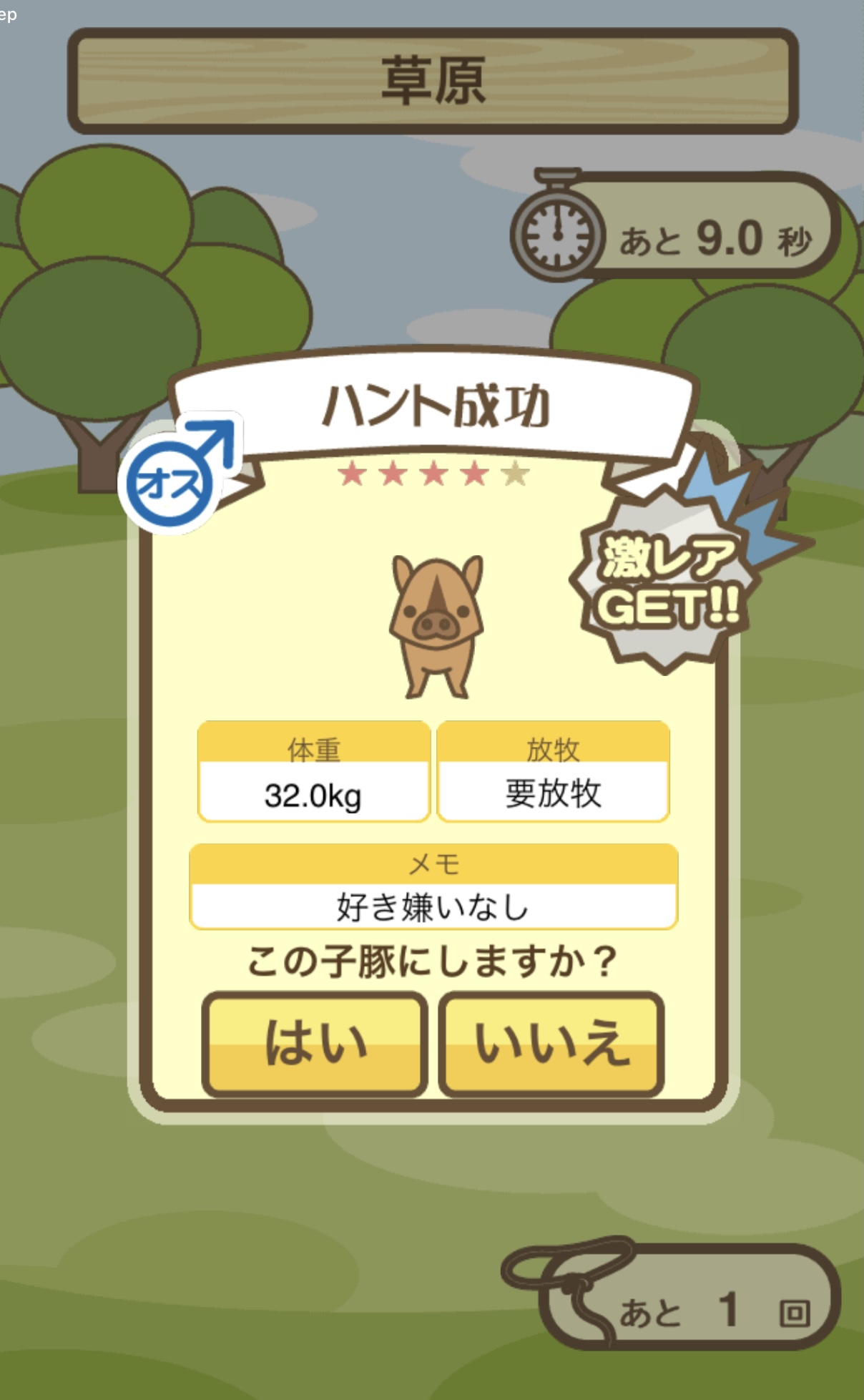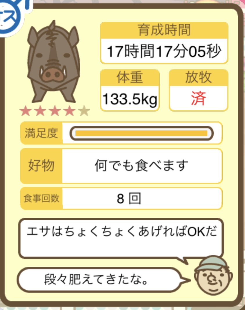 - 【追伸】それまで3回ほど18時台で挑戦しましたが、イノシシは出たが「要放牧」は出ず。もう少し遅い時間で挑戦。餌回数も少ないので安心して寝れます笑 -- 名無し[fnuFTd0QgU2] 2020/06/29 (月) 20:17:51