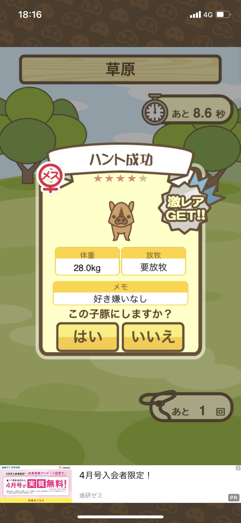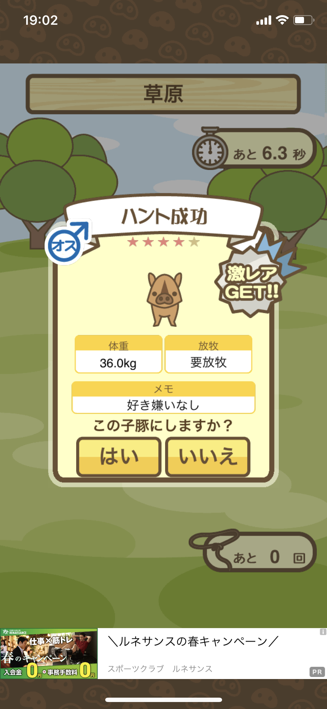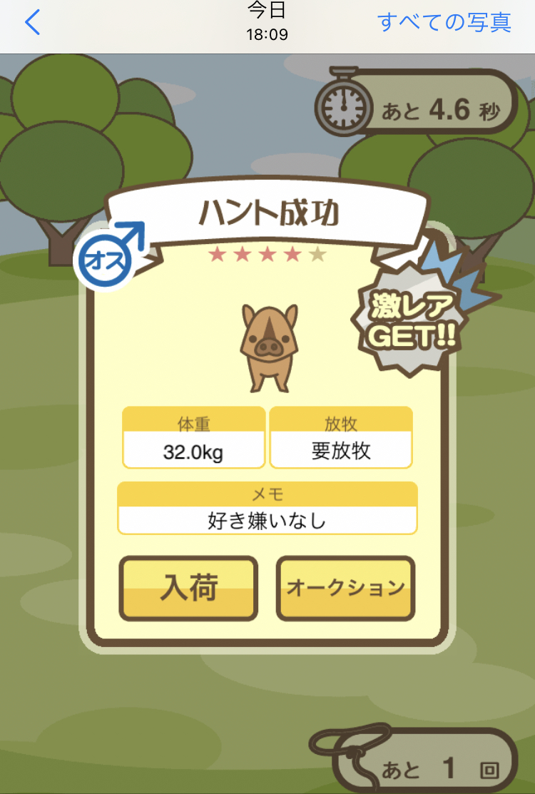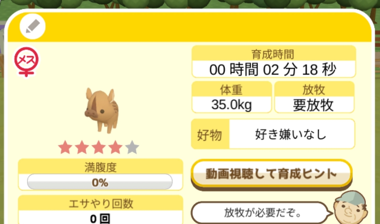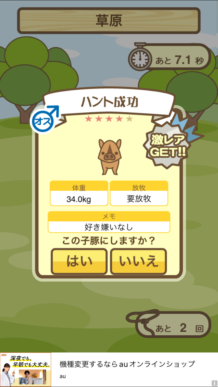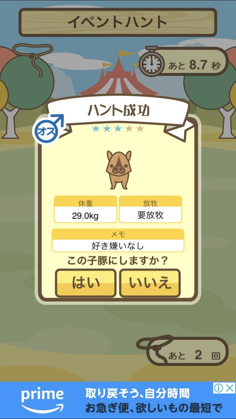 - 【追伸】それまで3回ほど18時台で挑戦しましたが、イノシシは出たが「要放牧」は出ず。もう少し遅い時間で挑戦。餌回数も少ないので安心して寝れます笑 -- 名無し[fnuFTd0QgU2] 2020/06/29 (月) 20:17:51
