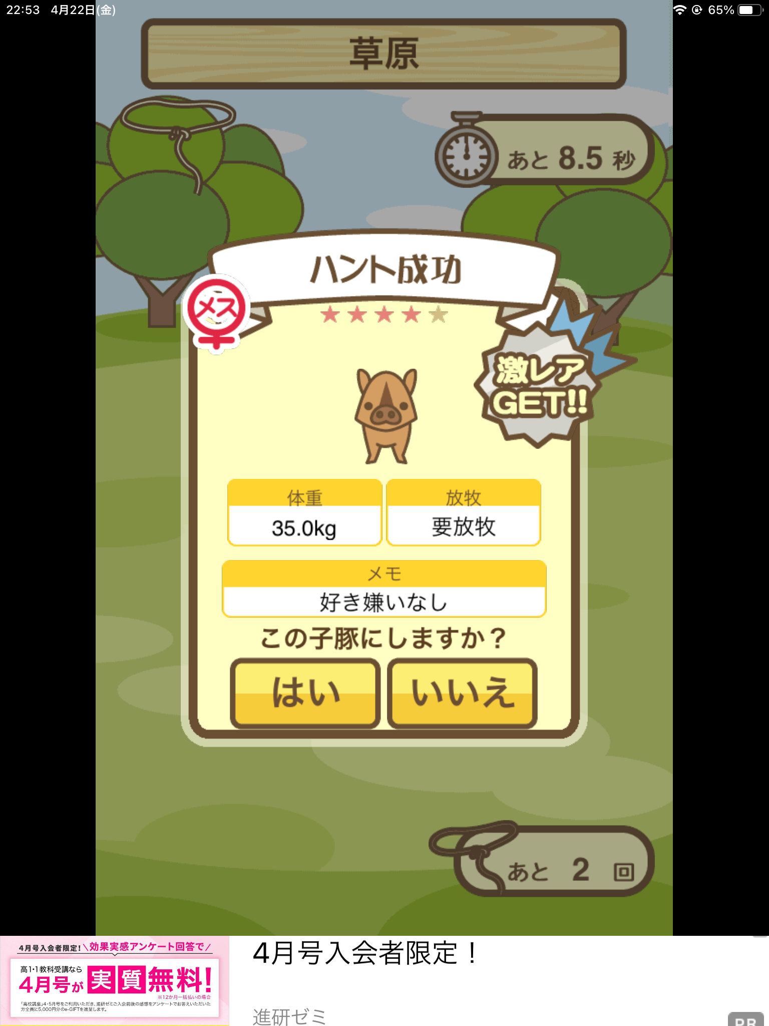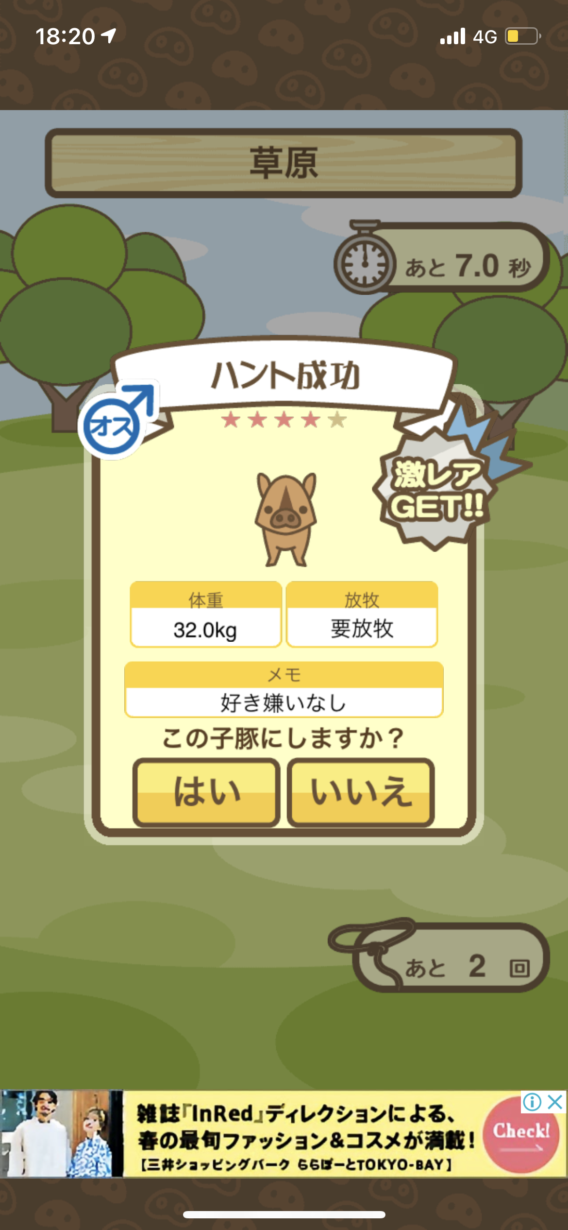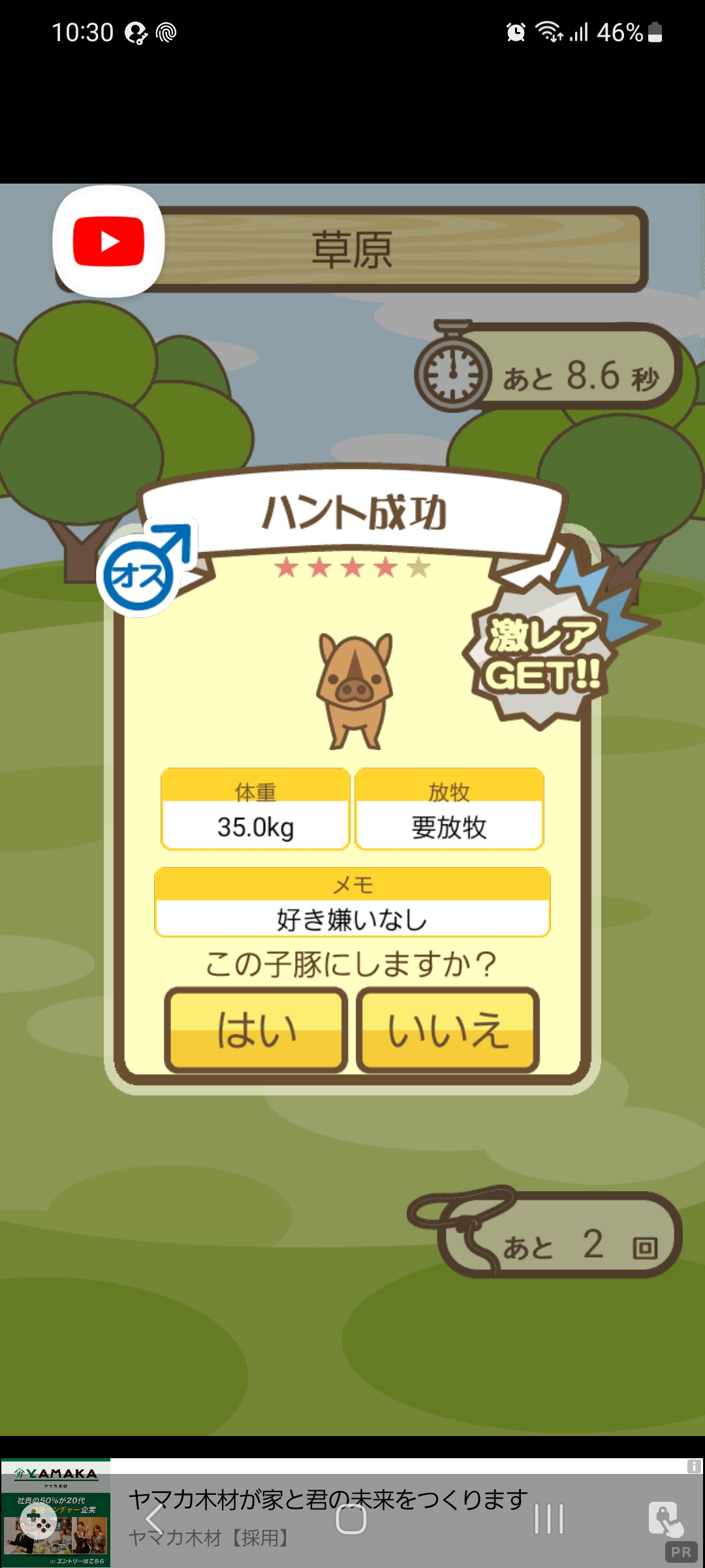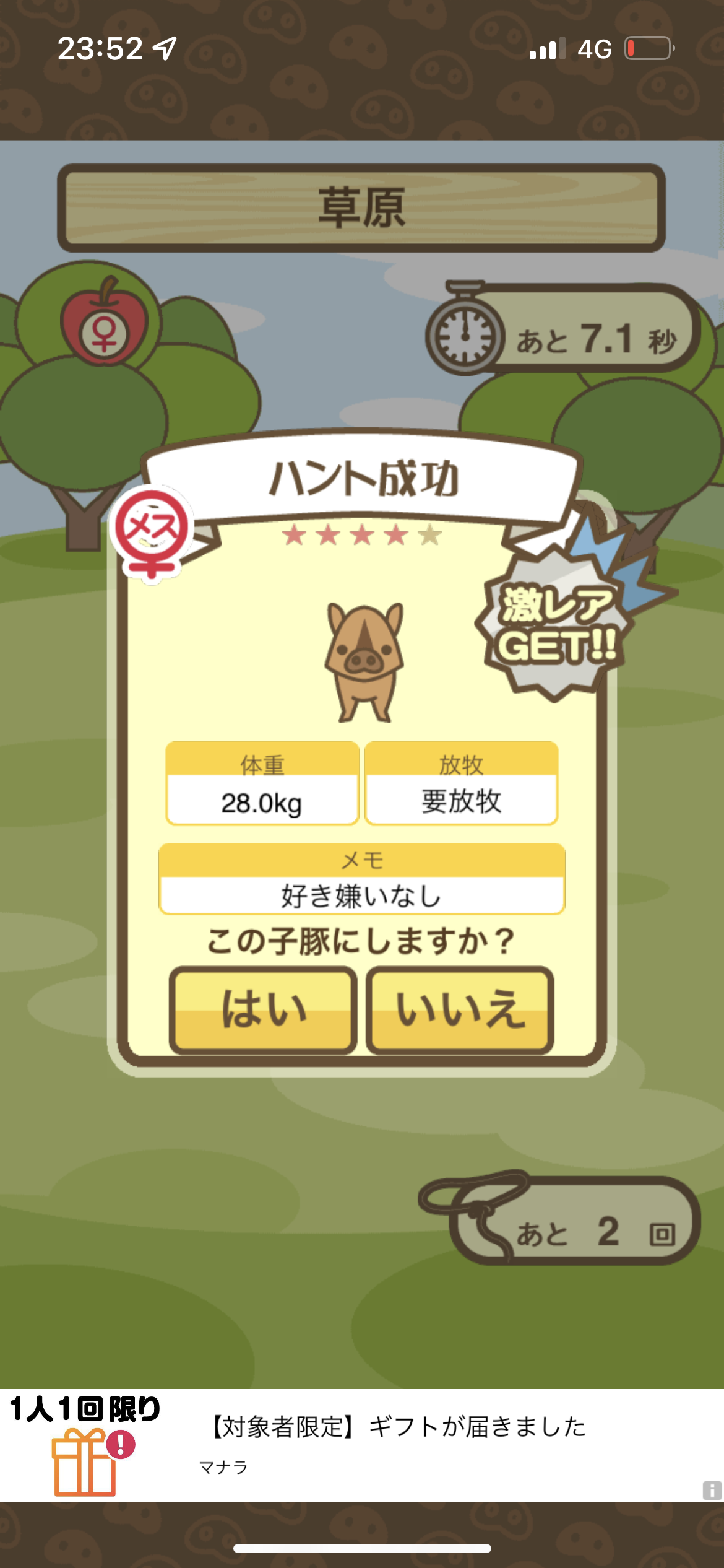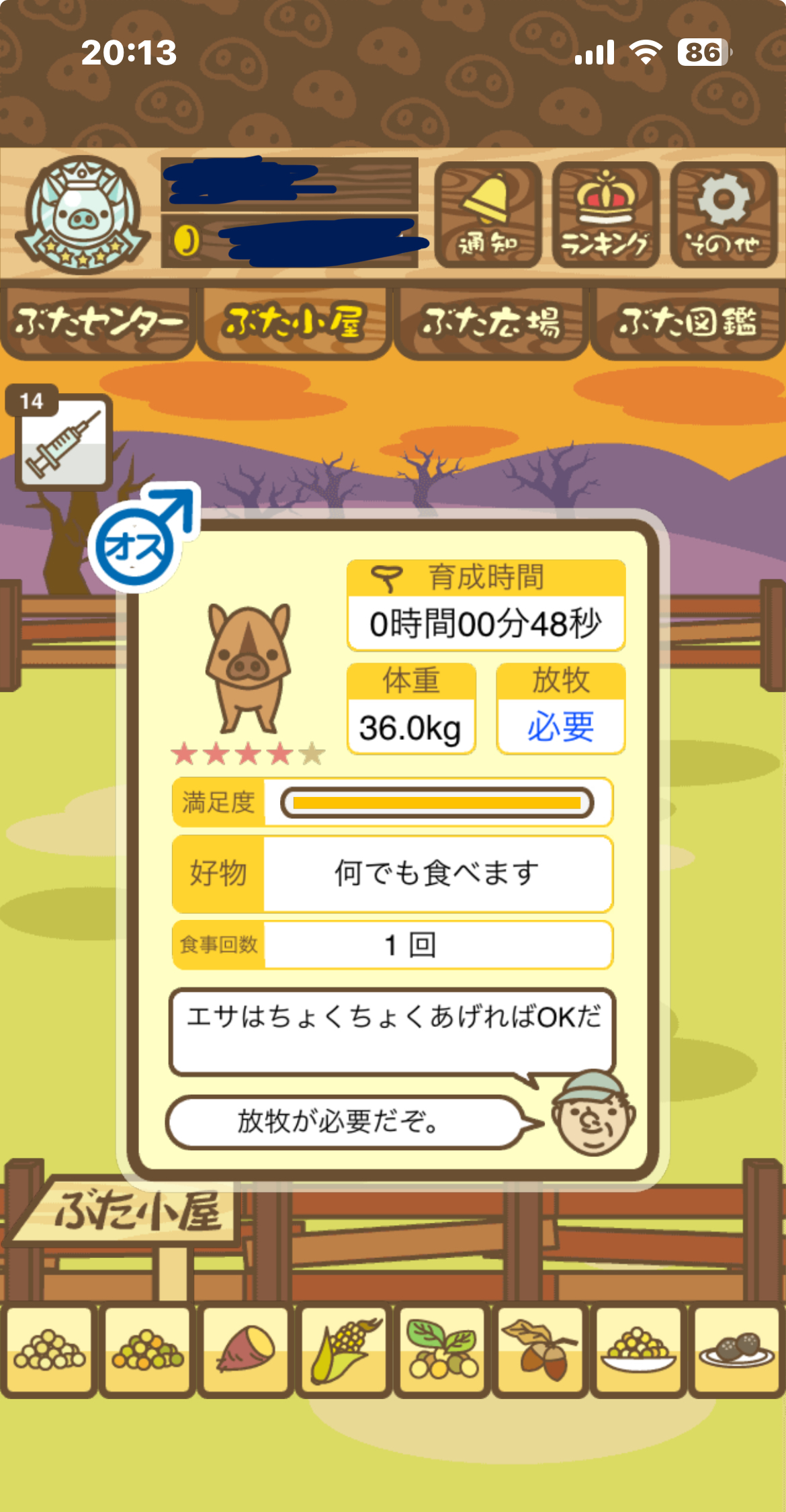 - 【追伸】それまで3回ほど18時台で挑戦しましたが、イノシシは出たが「要放牧」は出ず。もう少し遅い時間で挑戦。餌回数も少ないので安心して寝れます笑 -- 名無し[fnuFTd0QgU2] 2020/06/29 (月) 20:17:51