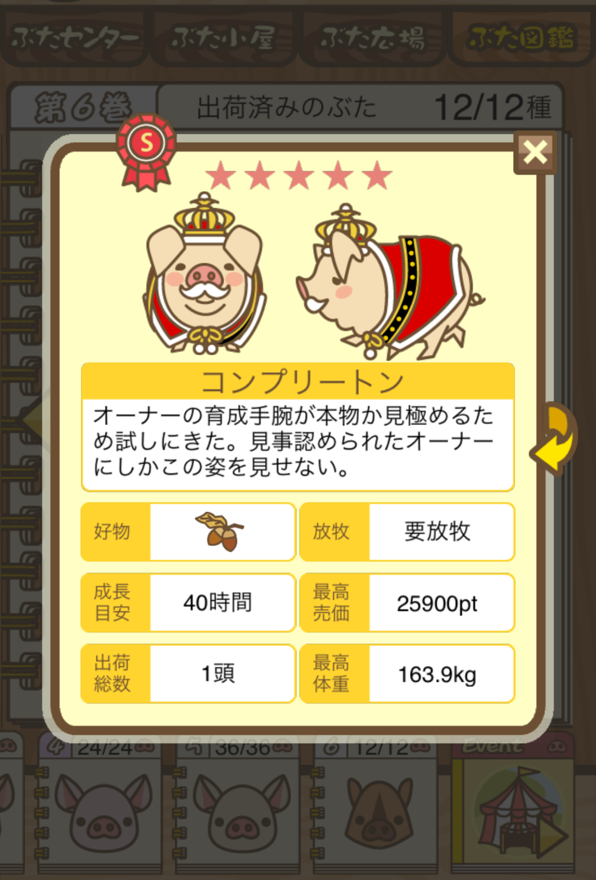 ぶた図鑑(イベントハント以外)を全てコンプリートすると新しく図鑑の第6巻に追加されるぶたさん。