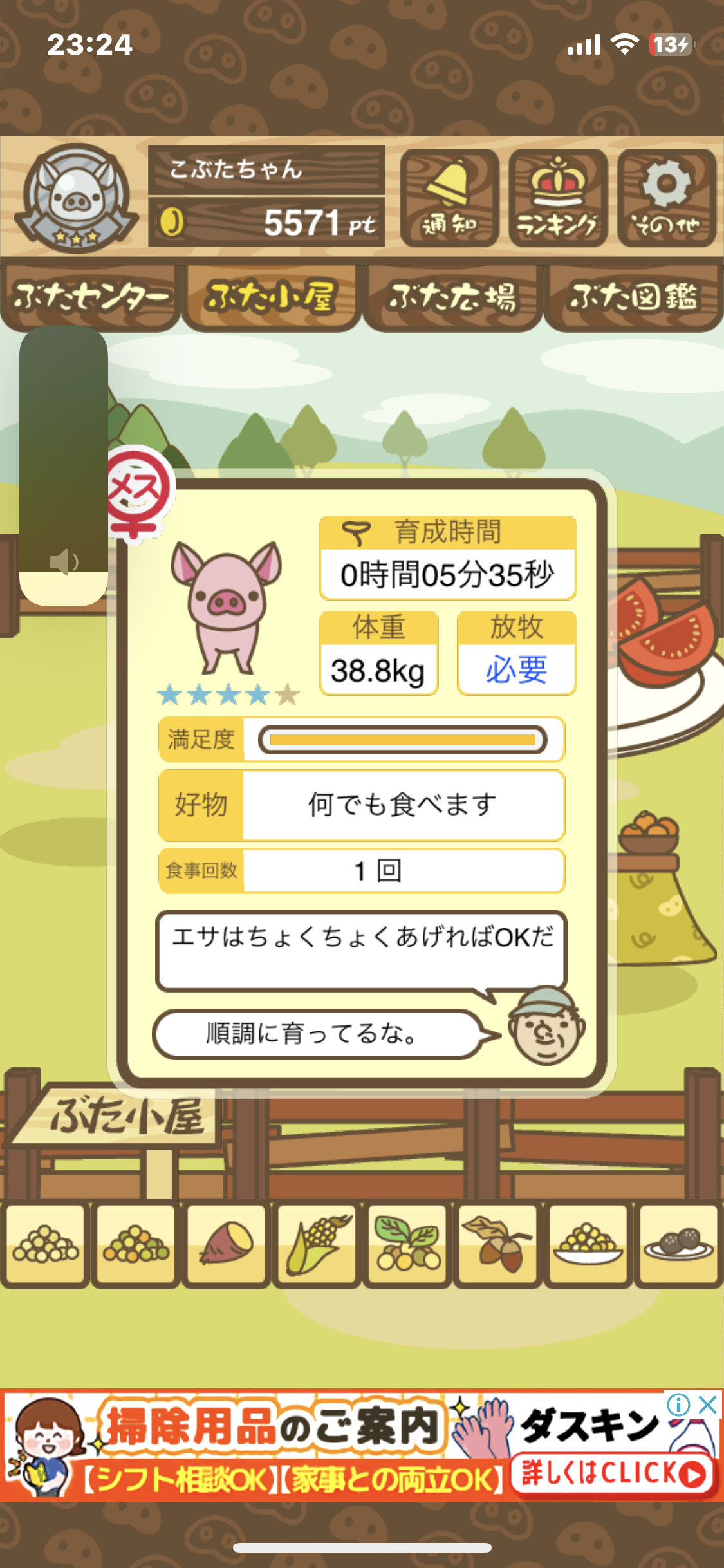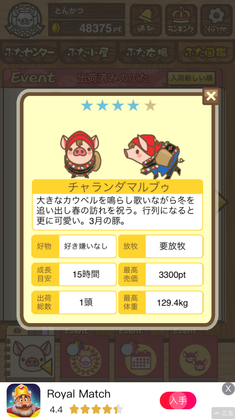 なお、最低エサ回数は1回だが、エサを1回食べさせたきり成豚するまで放牧場に放置すると育成失敗になる。