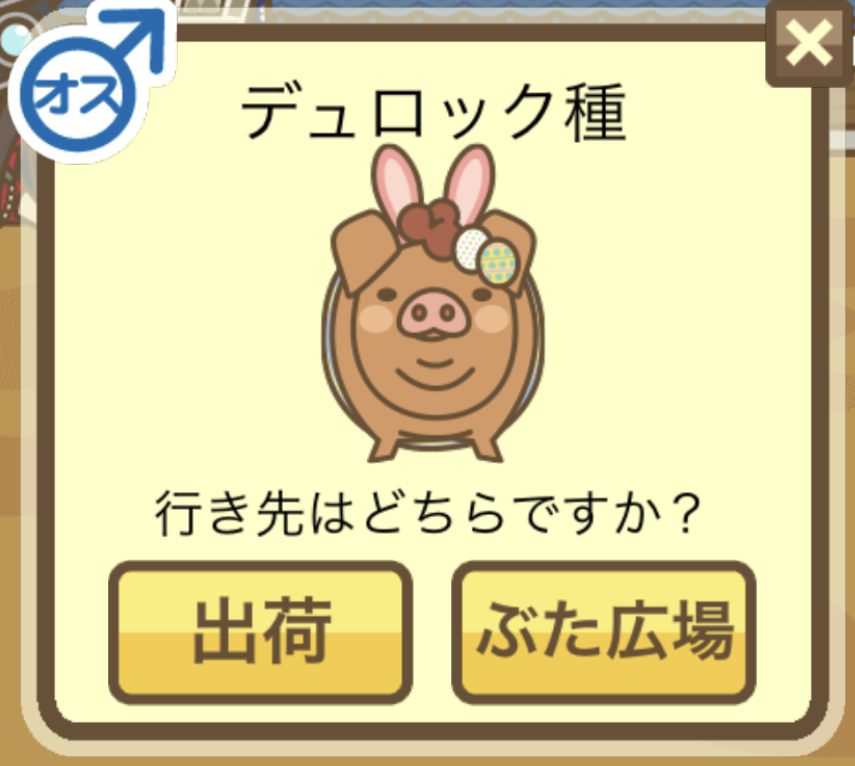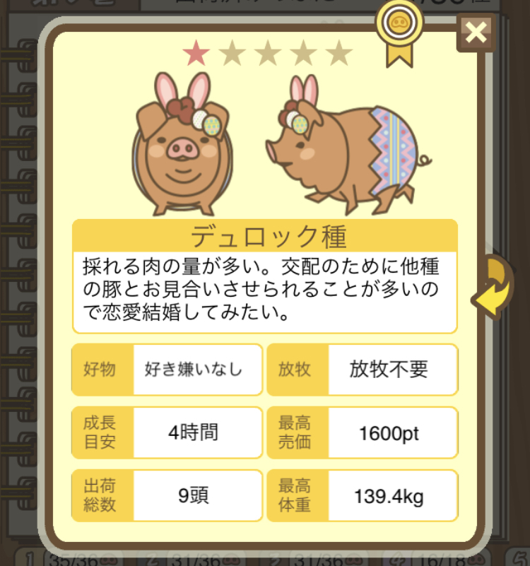 | 3D | 肉に多くの脂肪が混じるいわゆる 霜降りで肉量が多い大型の豚。オ スの交配候補として他種とよくお 見合いさせられる。自由恋愛の末 に結婚するのが夢。 |
