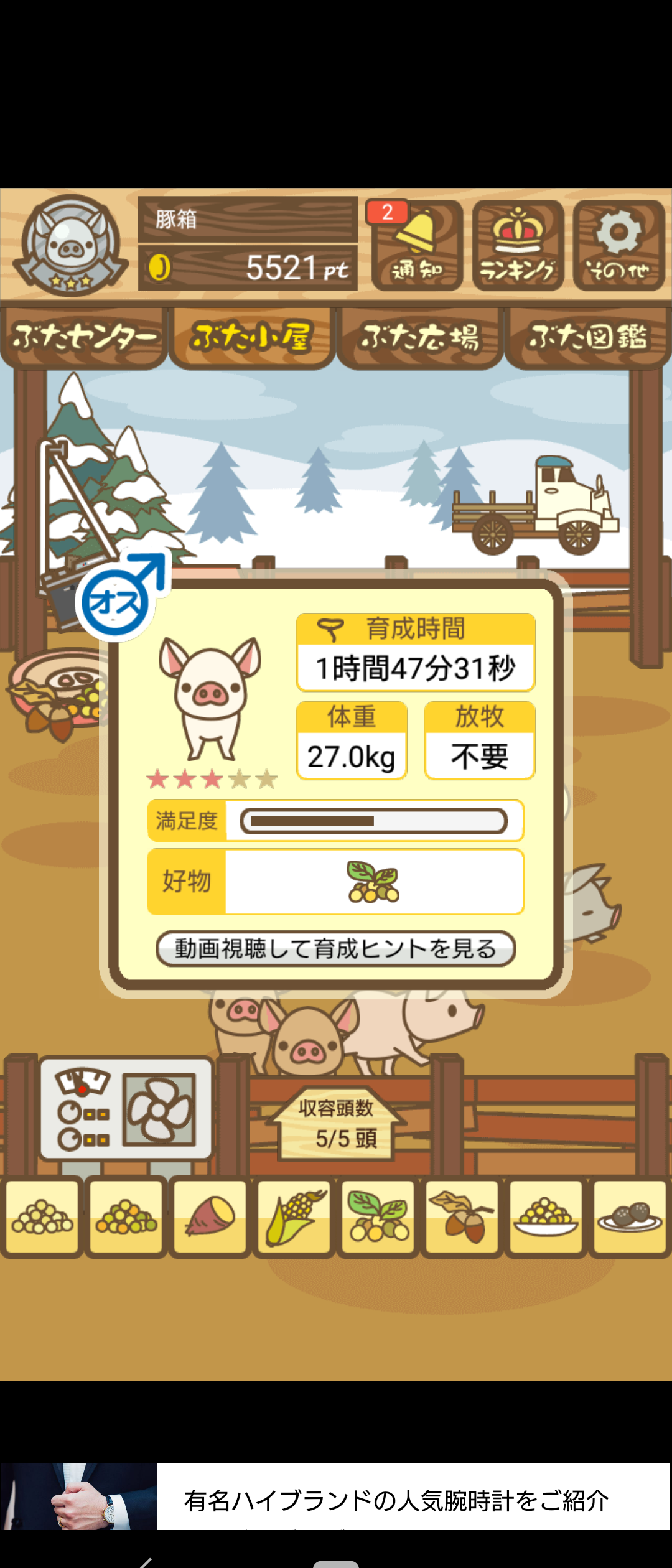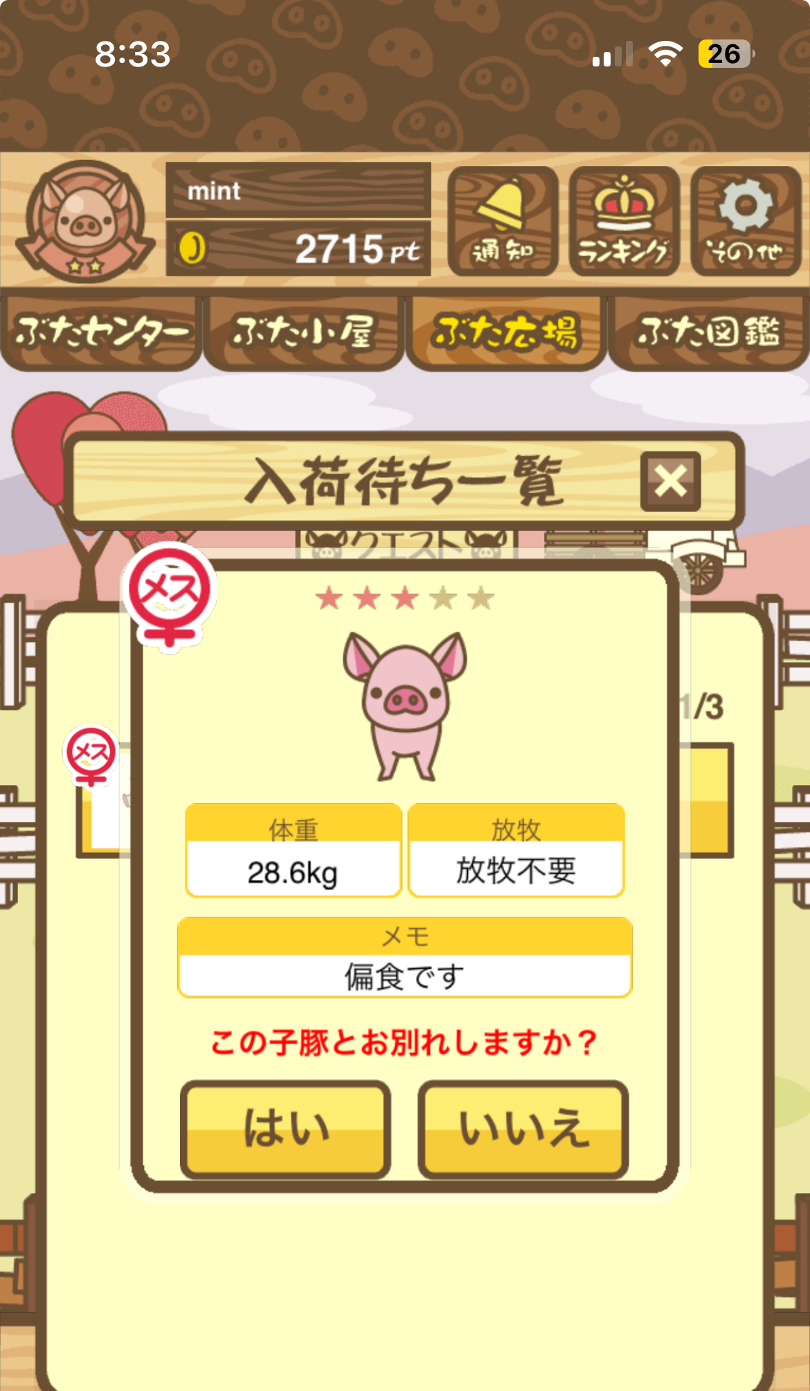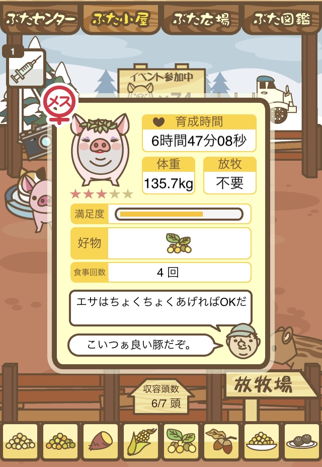 エサが少なくても育成に失敗しないせいか、ハーブ豚 よりも売値が低かったりすることが多い。