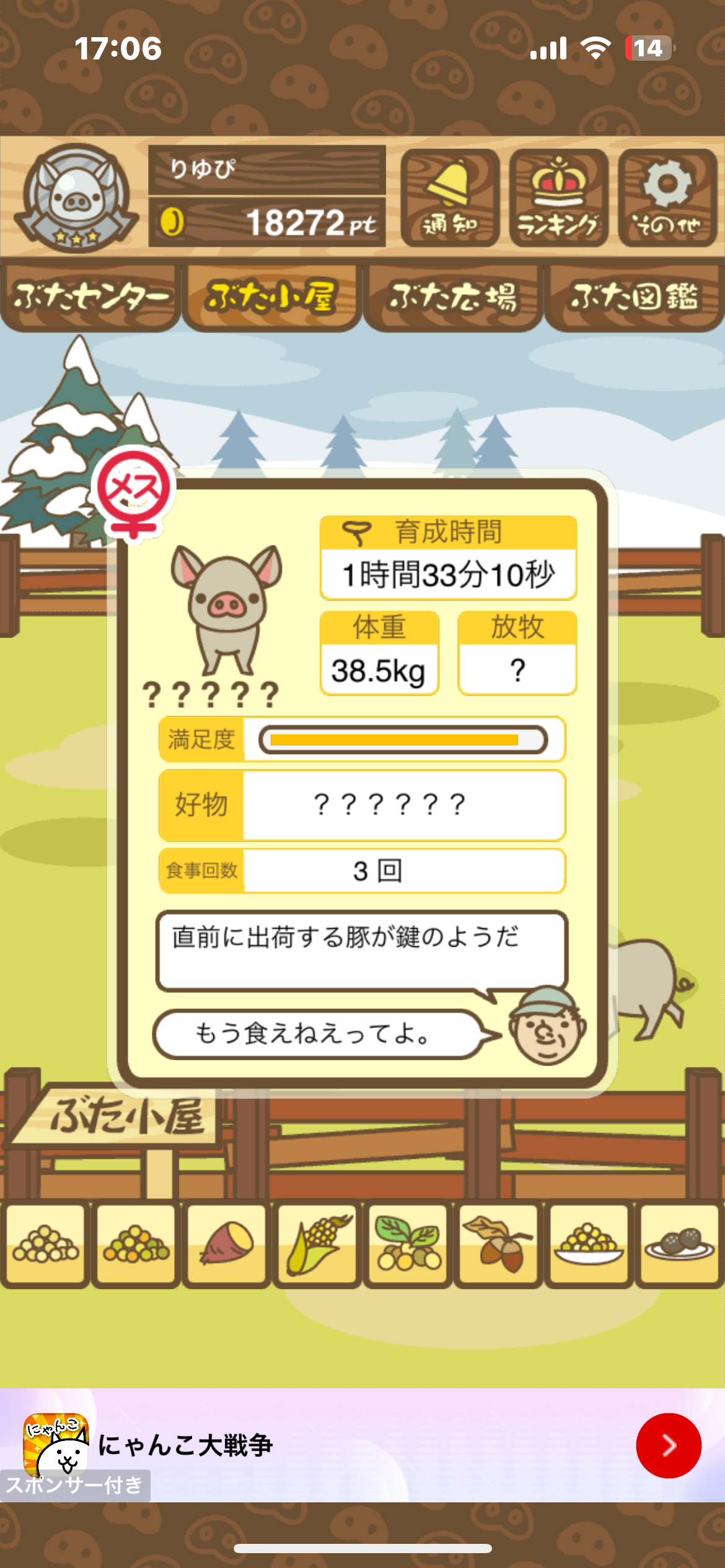 ヒント「直前に出荷する豚が鍵のようだ」「自分より大きな敵を葬りそうだ」