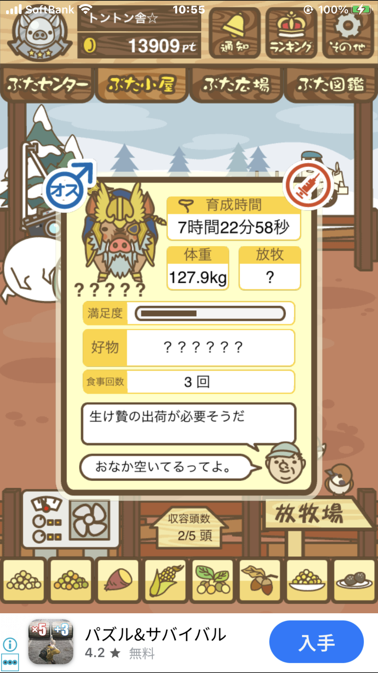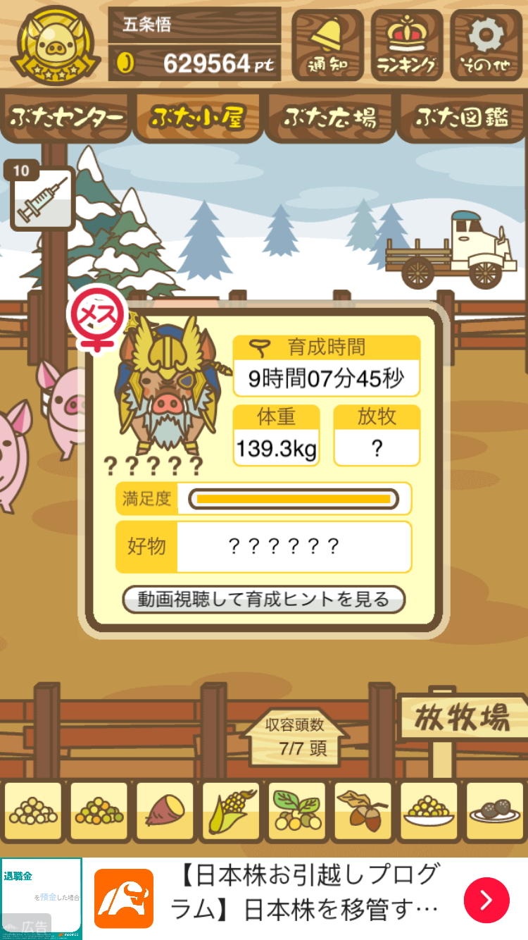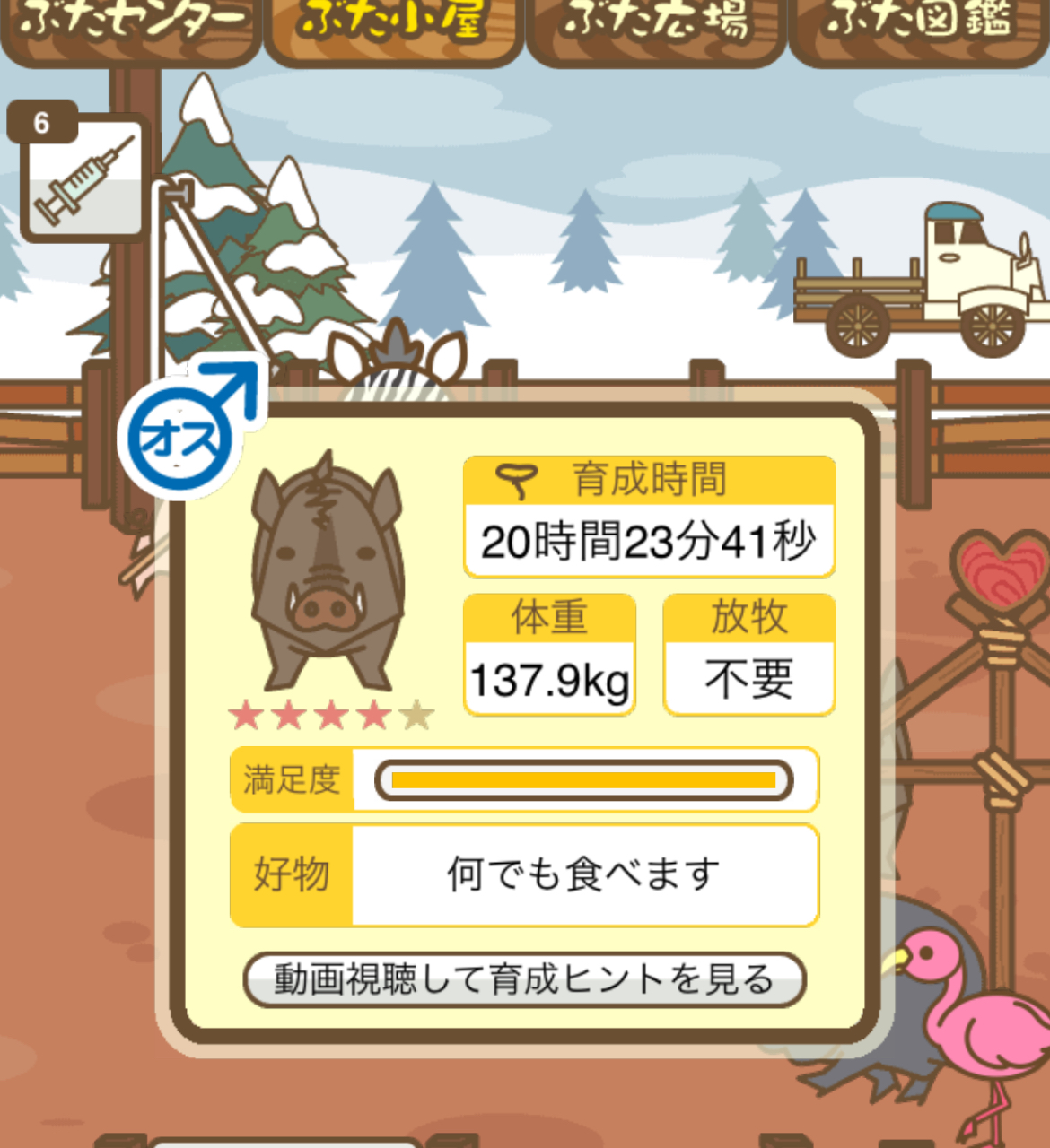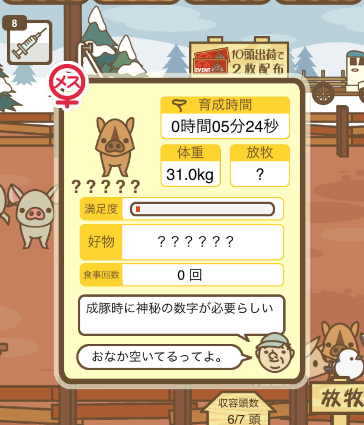 エサ0回でも育成成功するので、絶食のまま放置して成豚させよう。