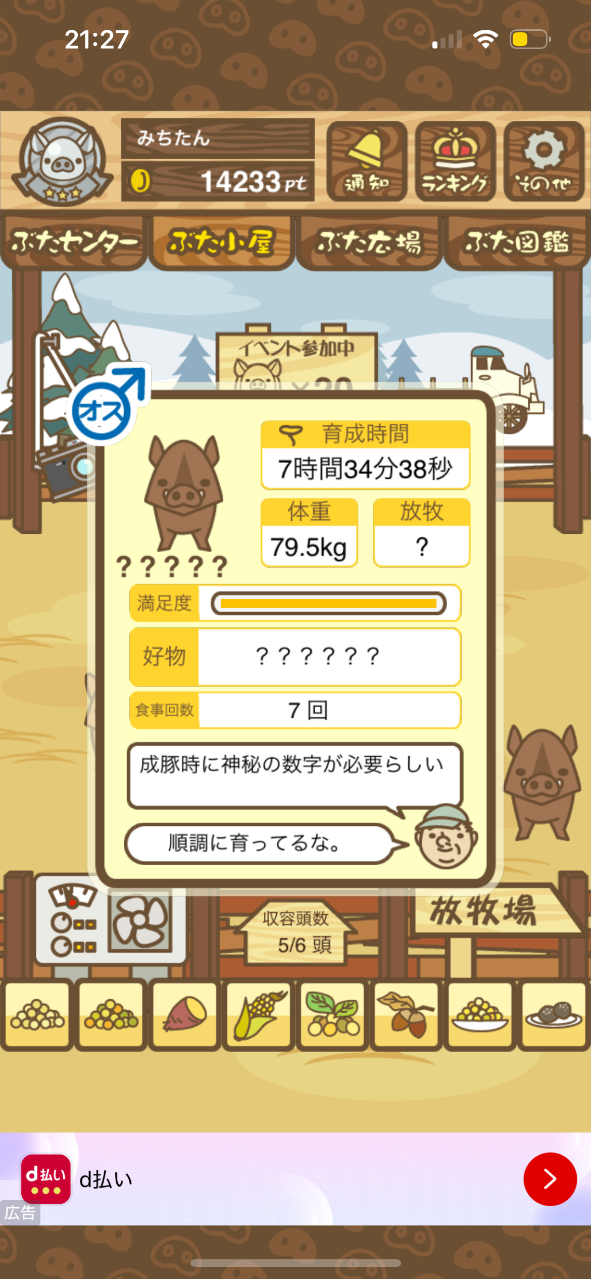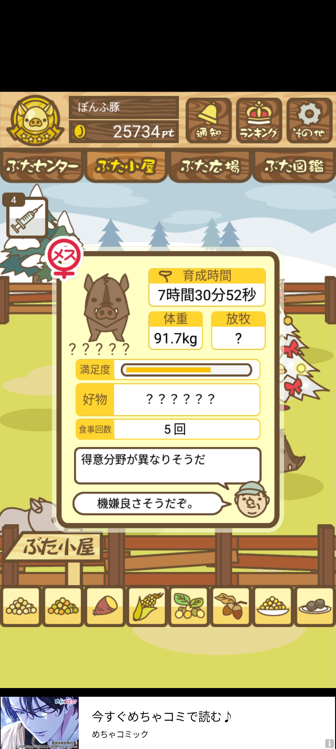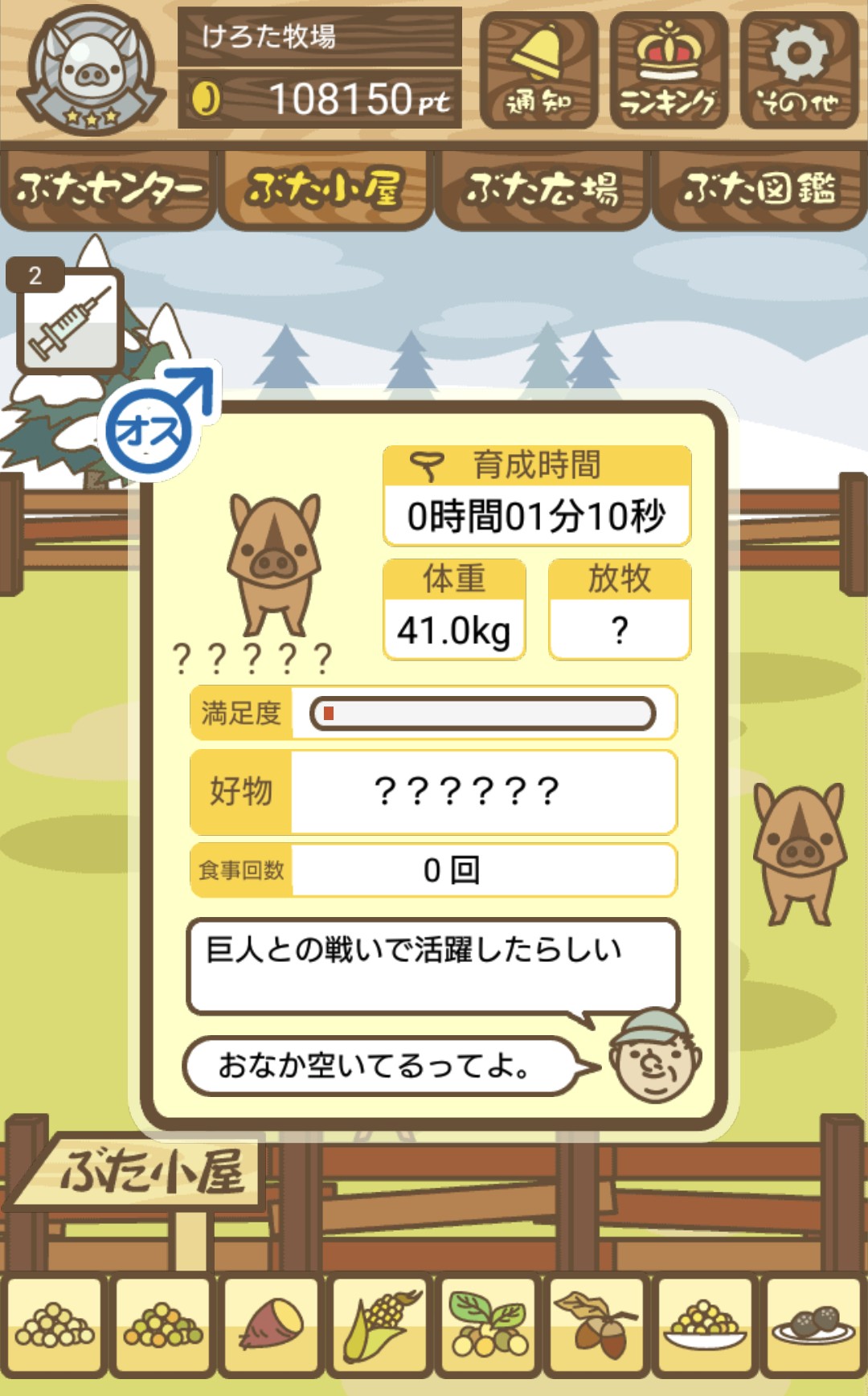 エサ0回でも育成成功するので、絶食のまま放置して成豚させよう。