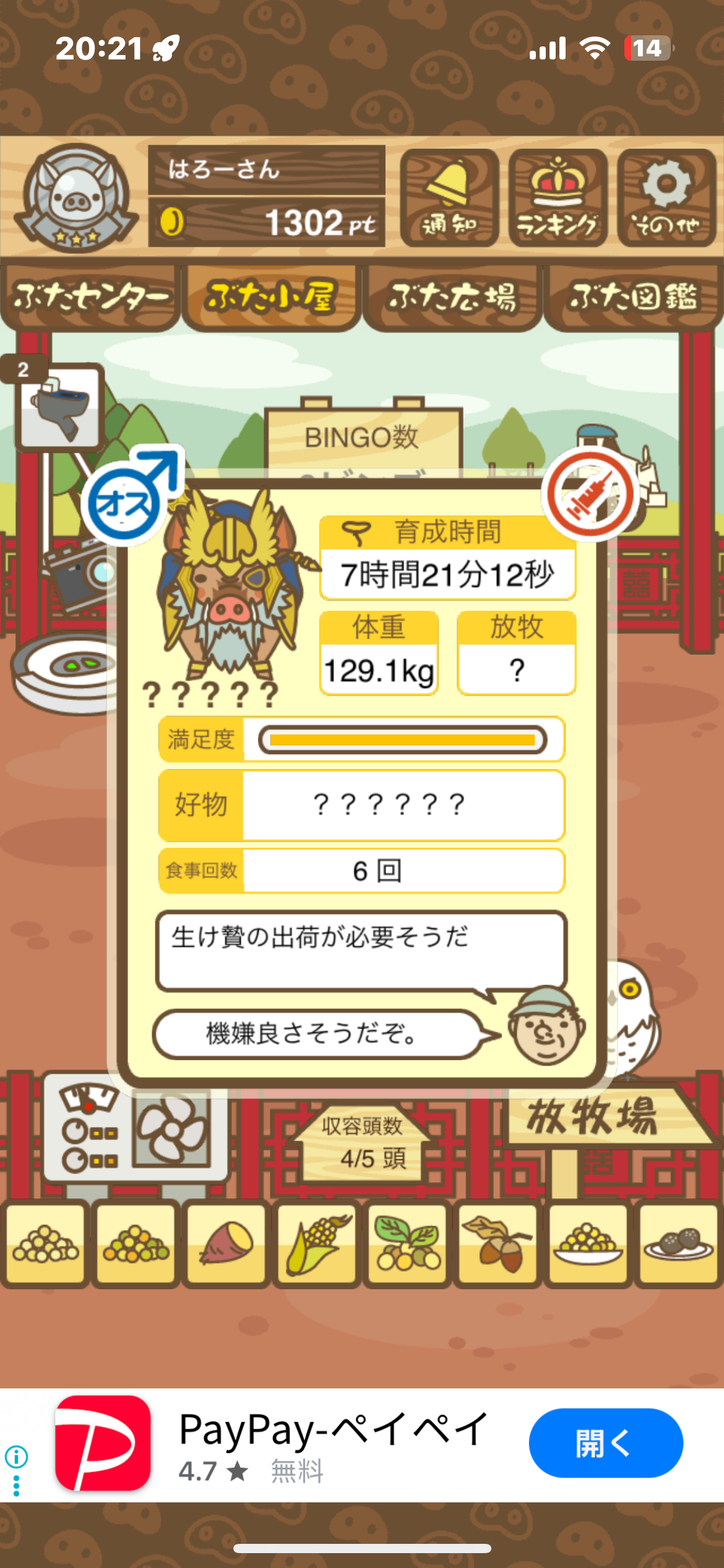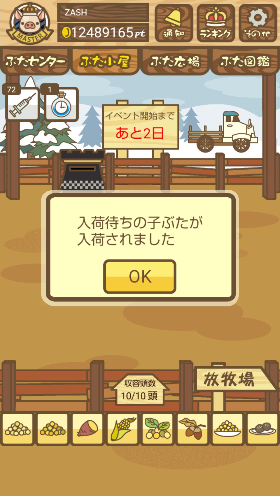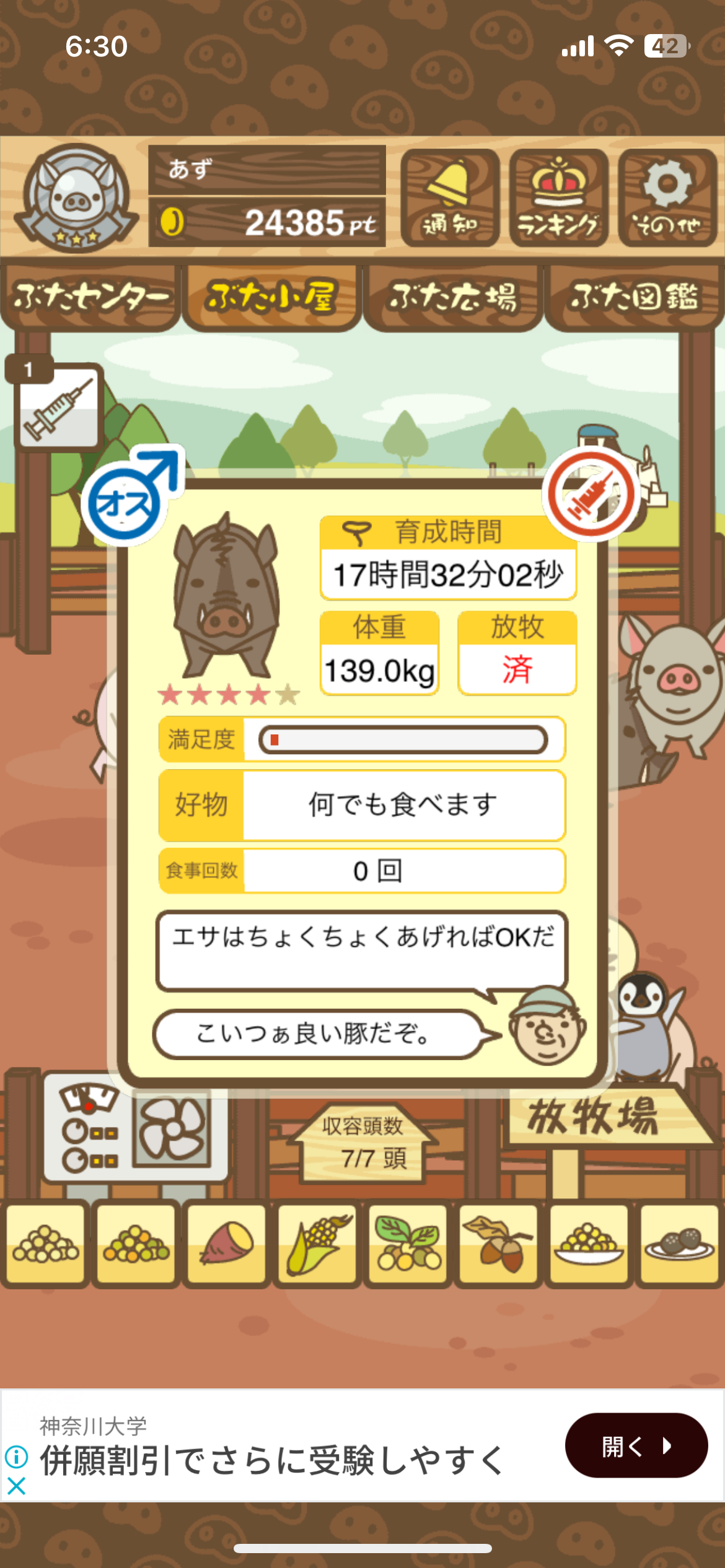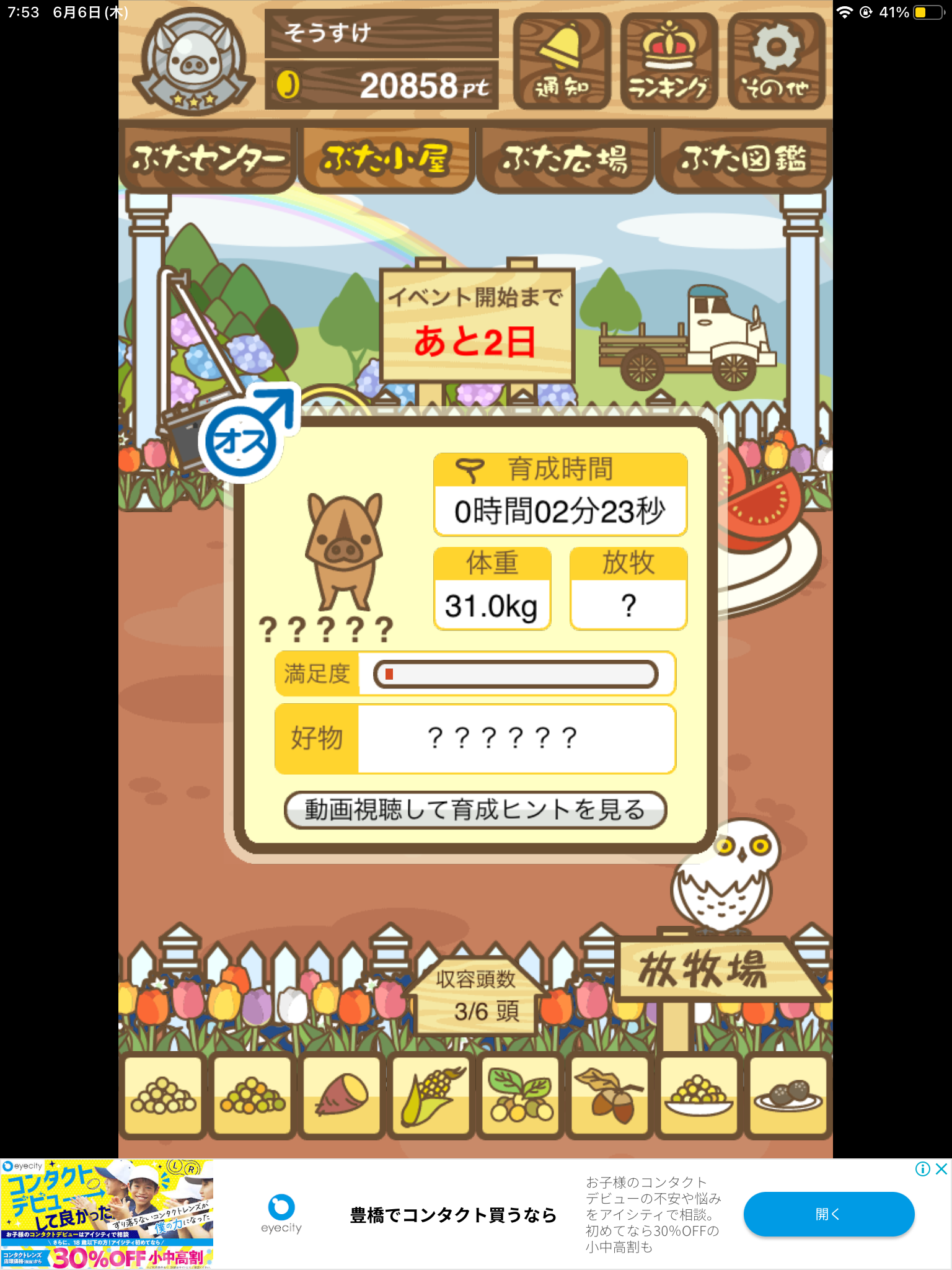 エサ0回でも育成成功するので、絶食のまま放置して成豚させよう。