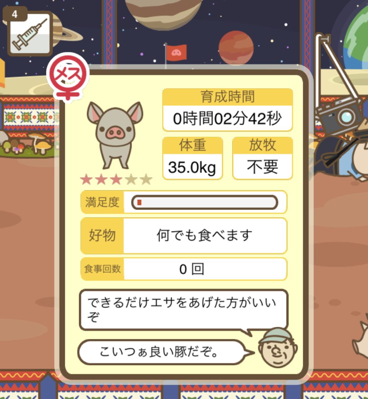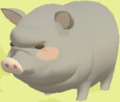 | 3D | 名前は太鼓腹の豚という意味。分 厚いシワが特徴的な迫力ある見た 目だが比較的小型な品種。いわゆ るミニブタ。エサのやりすぎにご 注意。 |