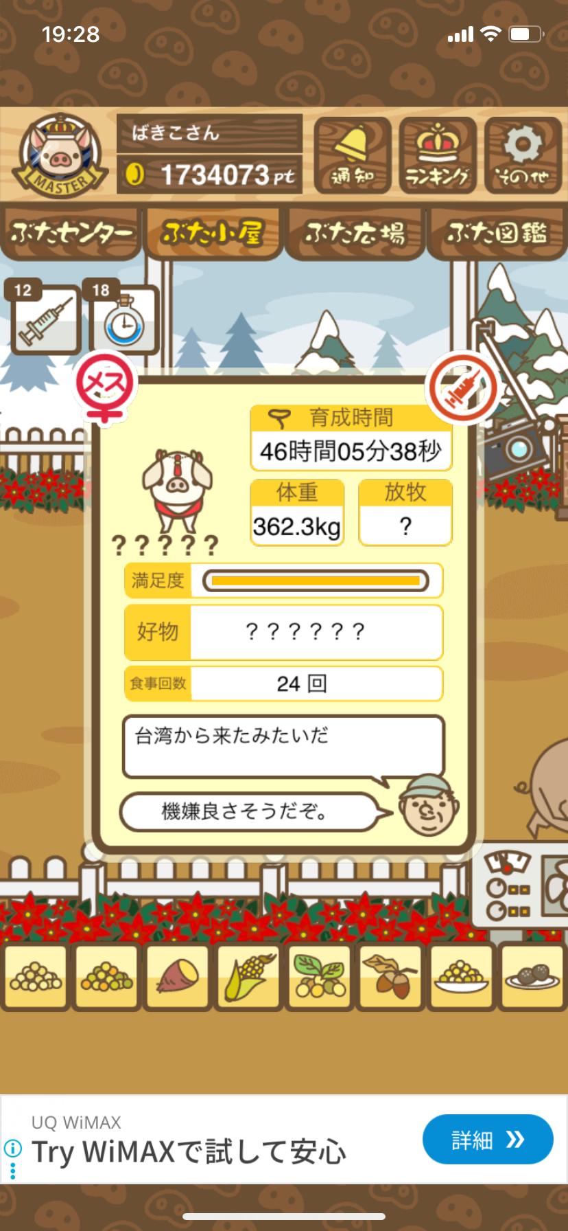 無事にマイクロ賽神豚に成豚すると、ブリーディングクエスト系の特別なアクションをするようになる。
