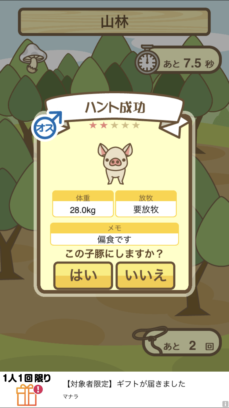 狙っていないぶたが捕まったら、リリースして再チャレンジしよう。