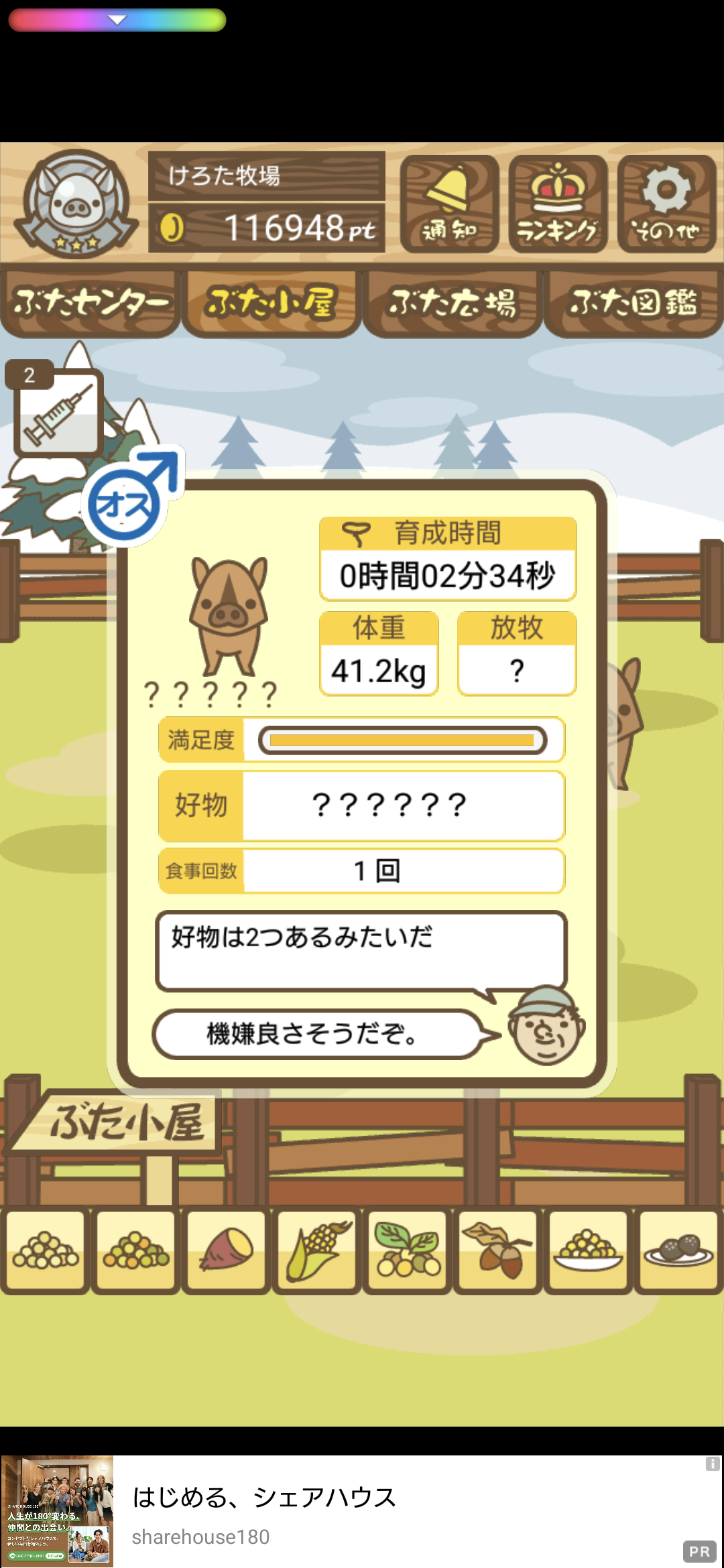 該当の「豚の巻」を交換済なら、特定の育成条件を満たすことで成長先が 別のぶた に変化する。