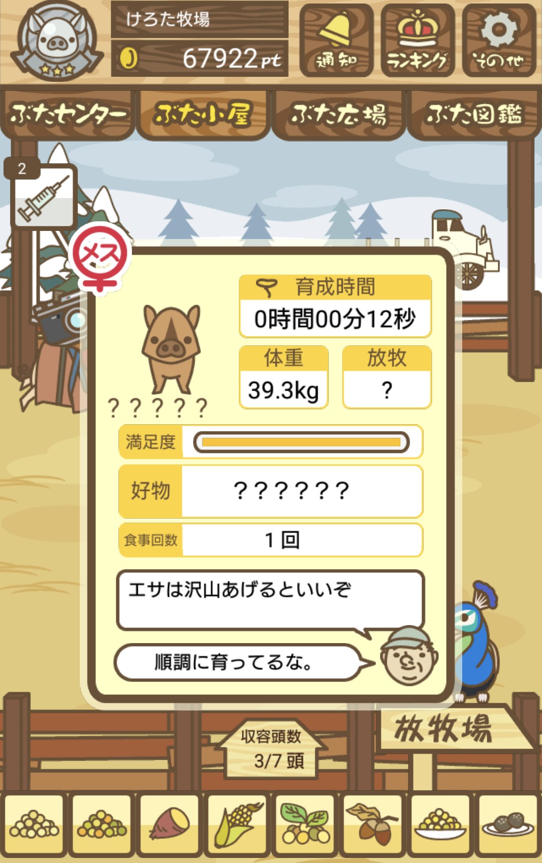 エサ回数は気にせず、体重だけを見て育成を頑張ろう。