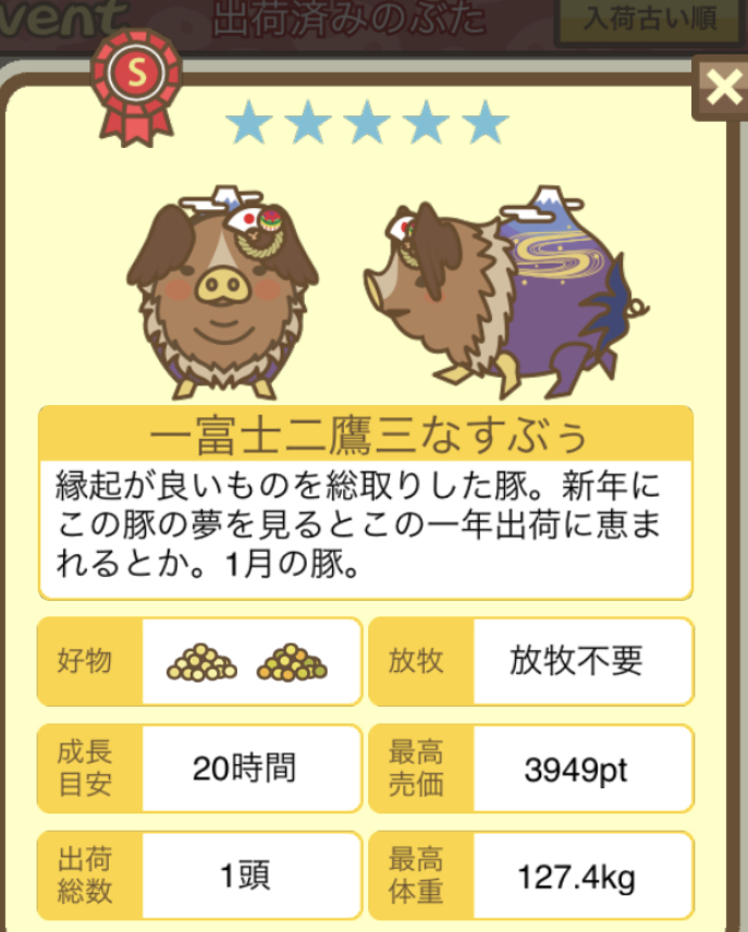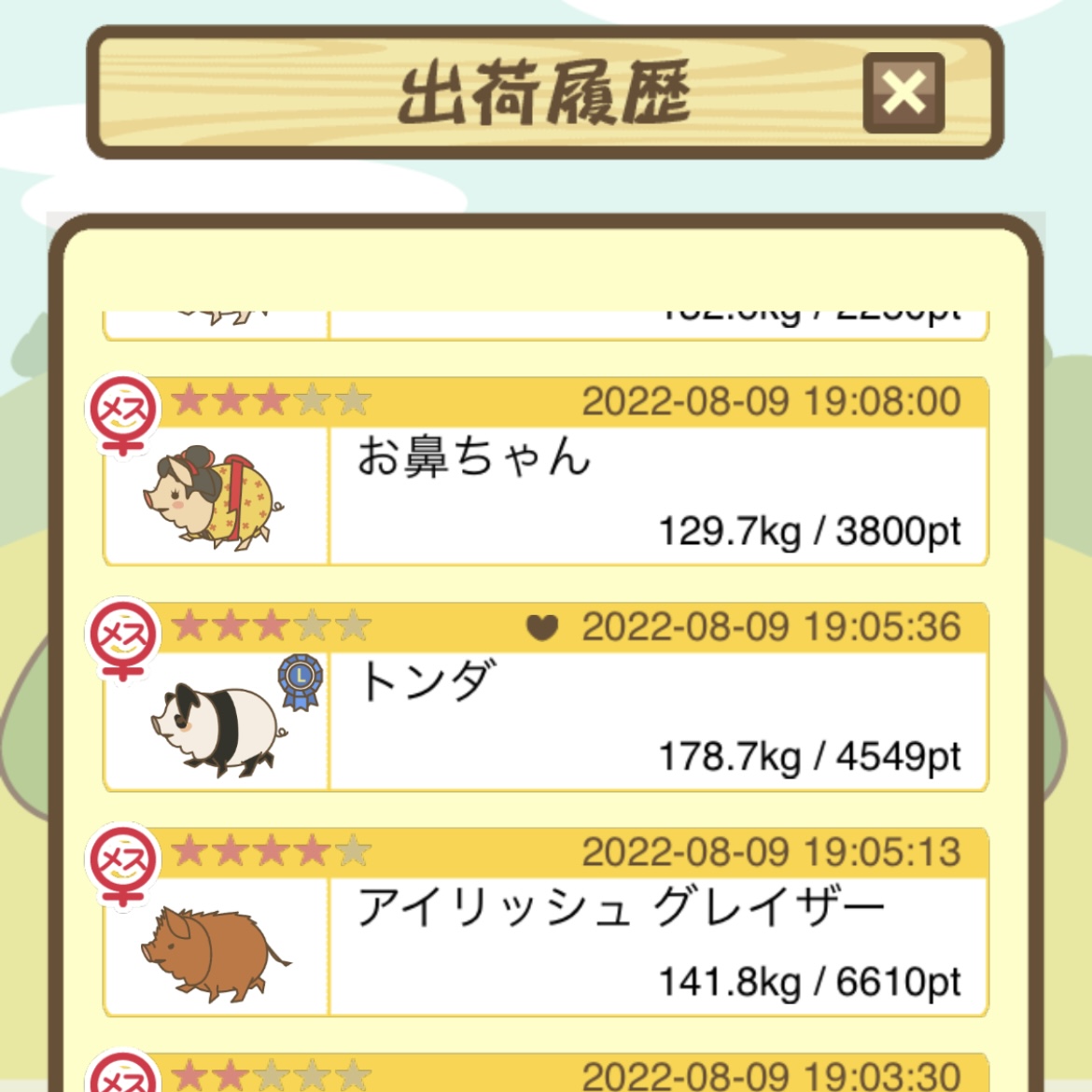 ② メトリディオコエルス/賽神豚 の2頭はボーナス体重も出荷ptの計算に反映されます。