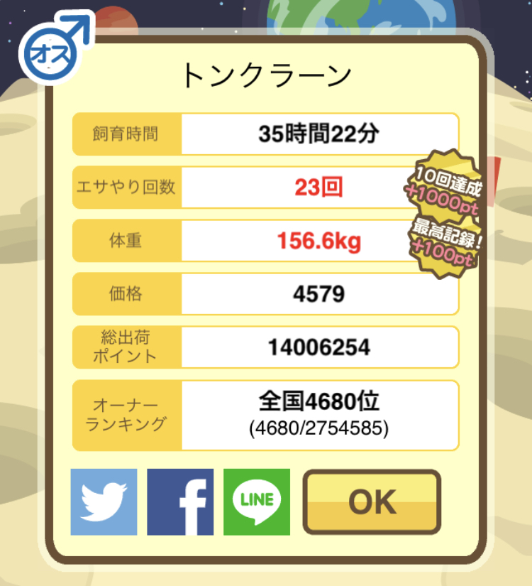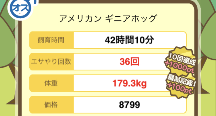 (ボーナスpt:エサ10回ボーナス1000pt・最高体重ボーナス100pt) - 倍率で割ってみて、値が100の倍数になったら基準出荷ptの可能性があるので表示