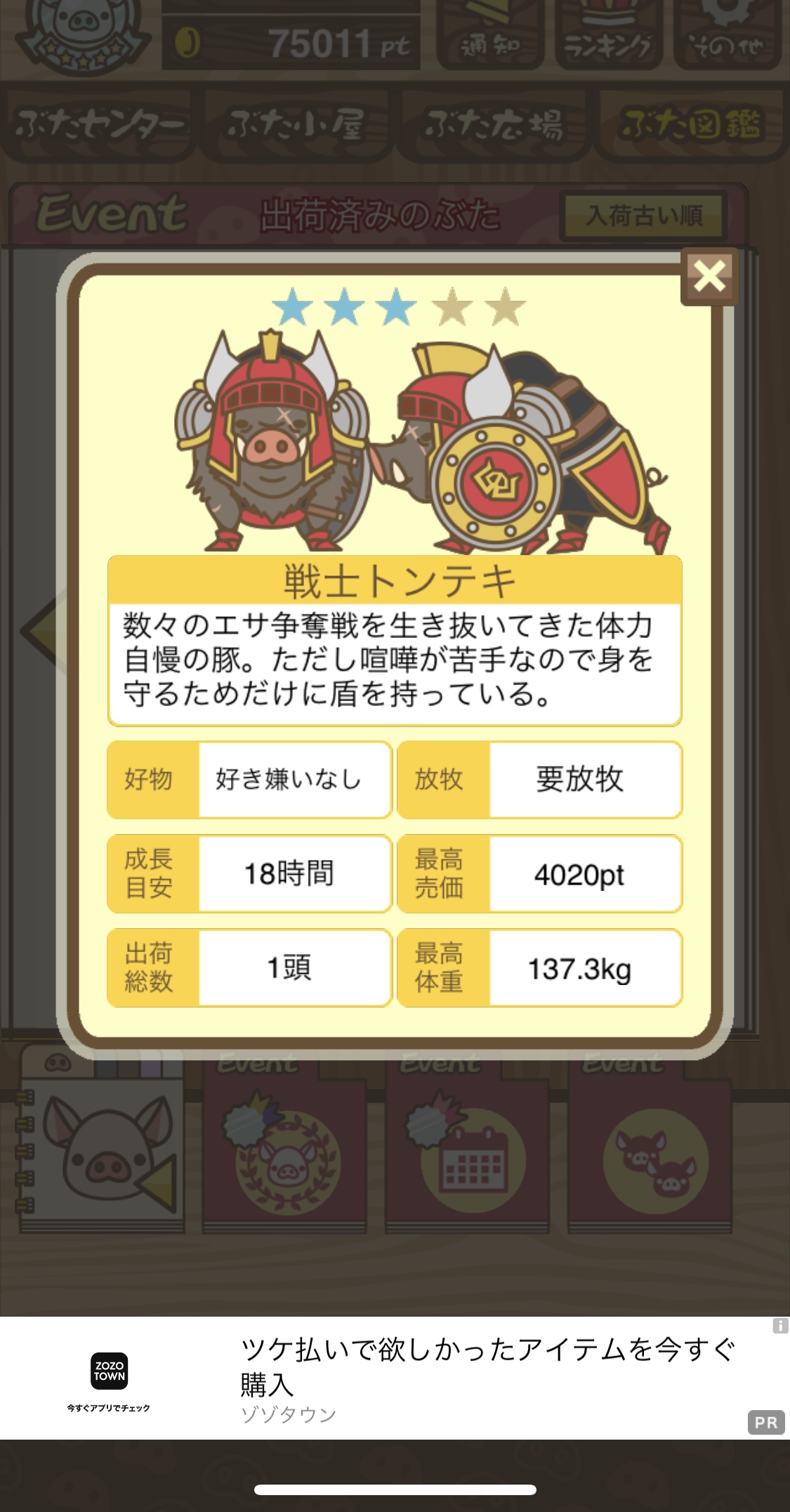 イノシシのほうが★の数が多いが、出荷ptはトンテキの方が高い。