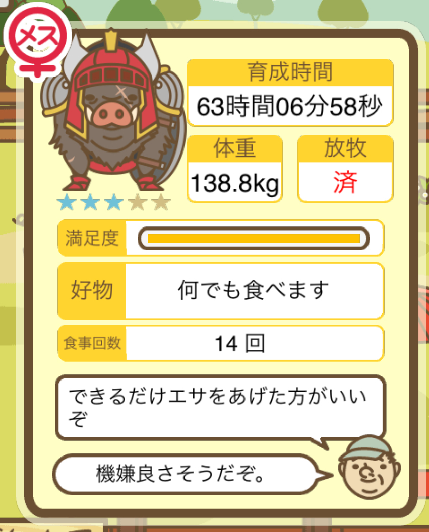 ちなみに、育成に失敗すると★4の イノシシ になる。