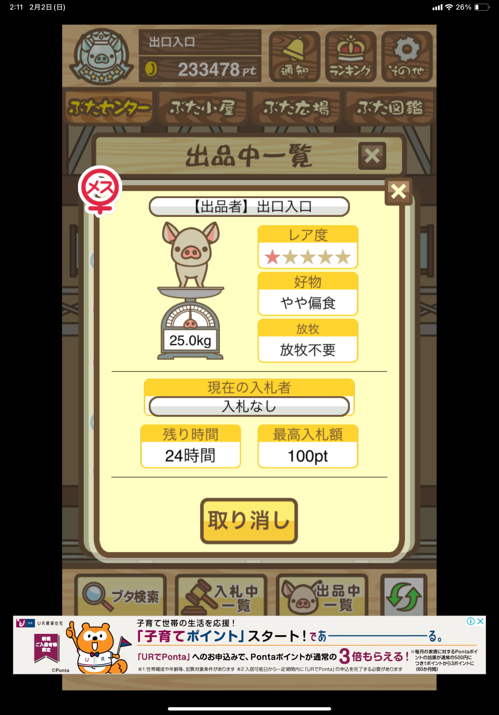 オークションにぶたセンターCランクの適当なぶたを2~3頭出品したあと、詳細画面のスクショを投稿してください。