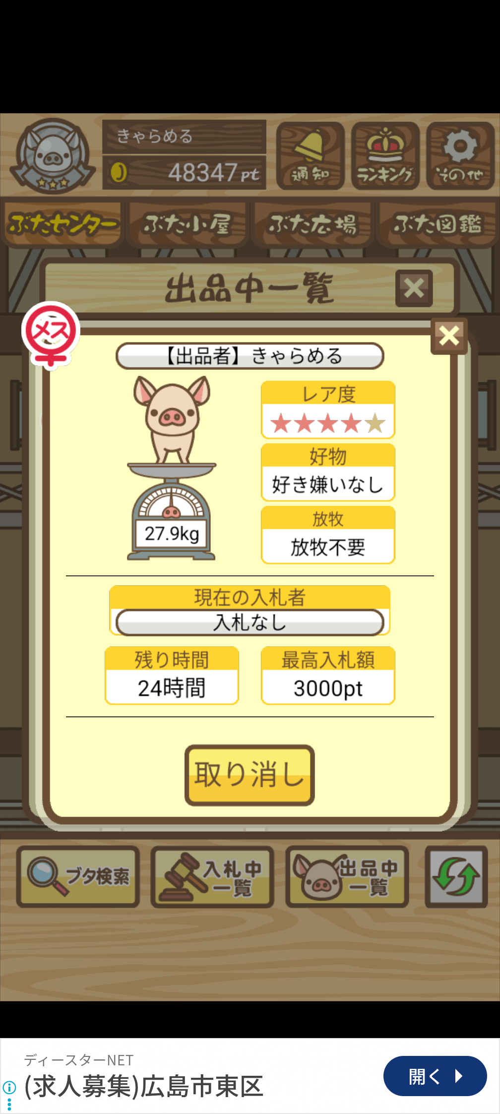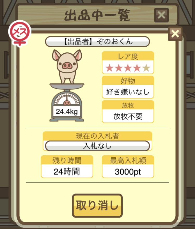 オークションに 特定のぶた を2頭くらい出品したあと、詳細画面のスクショを投稿してください。